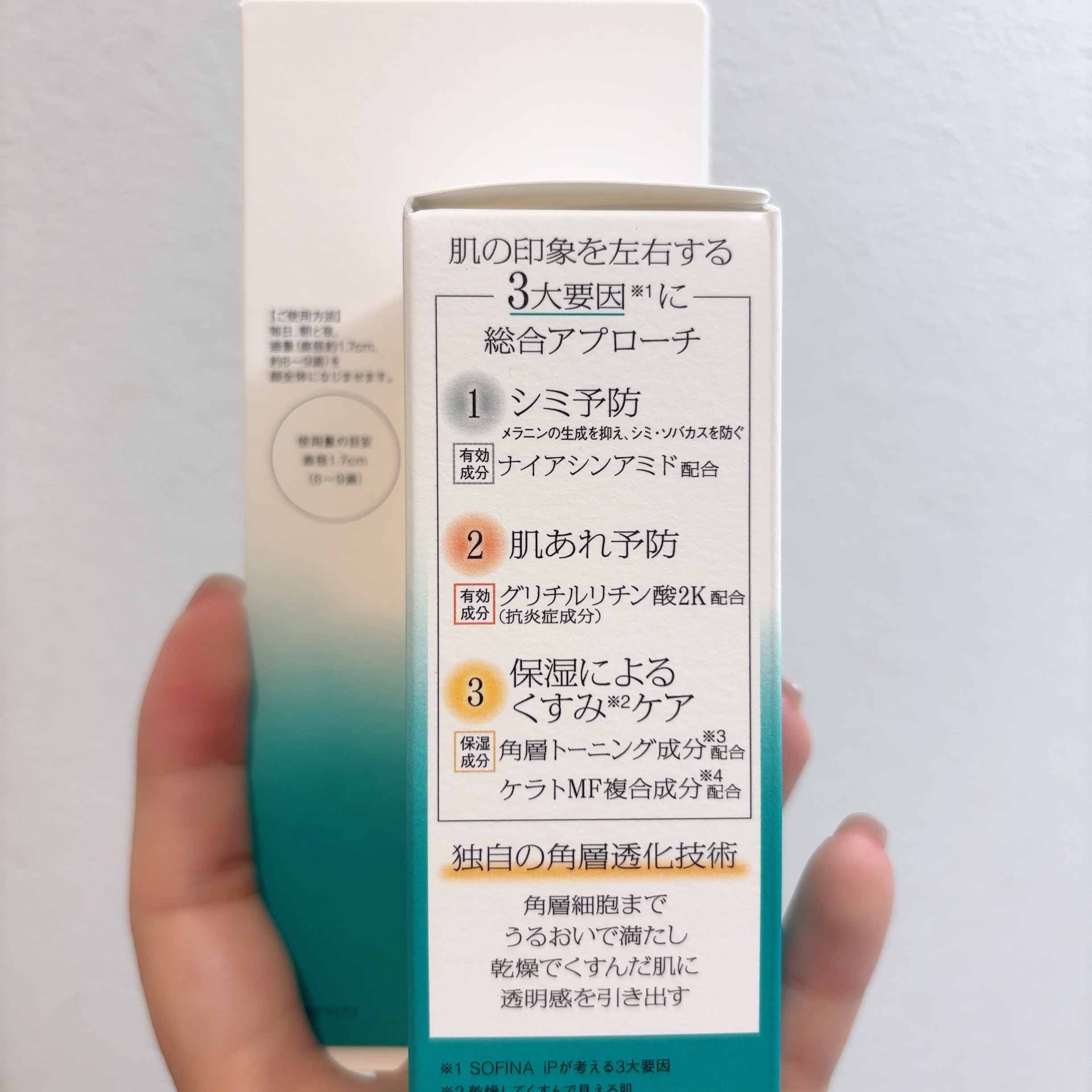 - 【医薬部外品】 2つの有効成分と角層透化技術®で、肌印象の<3大要因>*1に総合アプローチ。 ❶シミ予防*2(有効成分:ナイアシンアミド配合) ❷肌あれ予防(有効成分:グリチルリチン酸2K配合) ❸保湿によるくすみ*3ケア(角層透化技術®) 〇角層までうるおいで満たし、乾燥でくすんだ肌に透明感・明るい印象を引き出す *1 SOFINAiPが考える3大要因 *2 メラニンの生成を抑え、シミ・ソバカスを防ぐ *3 乾燥してくすんで見える肌