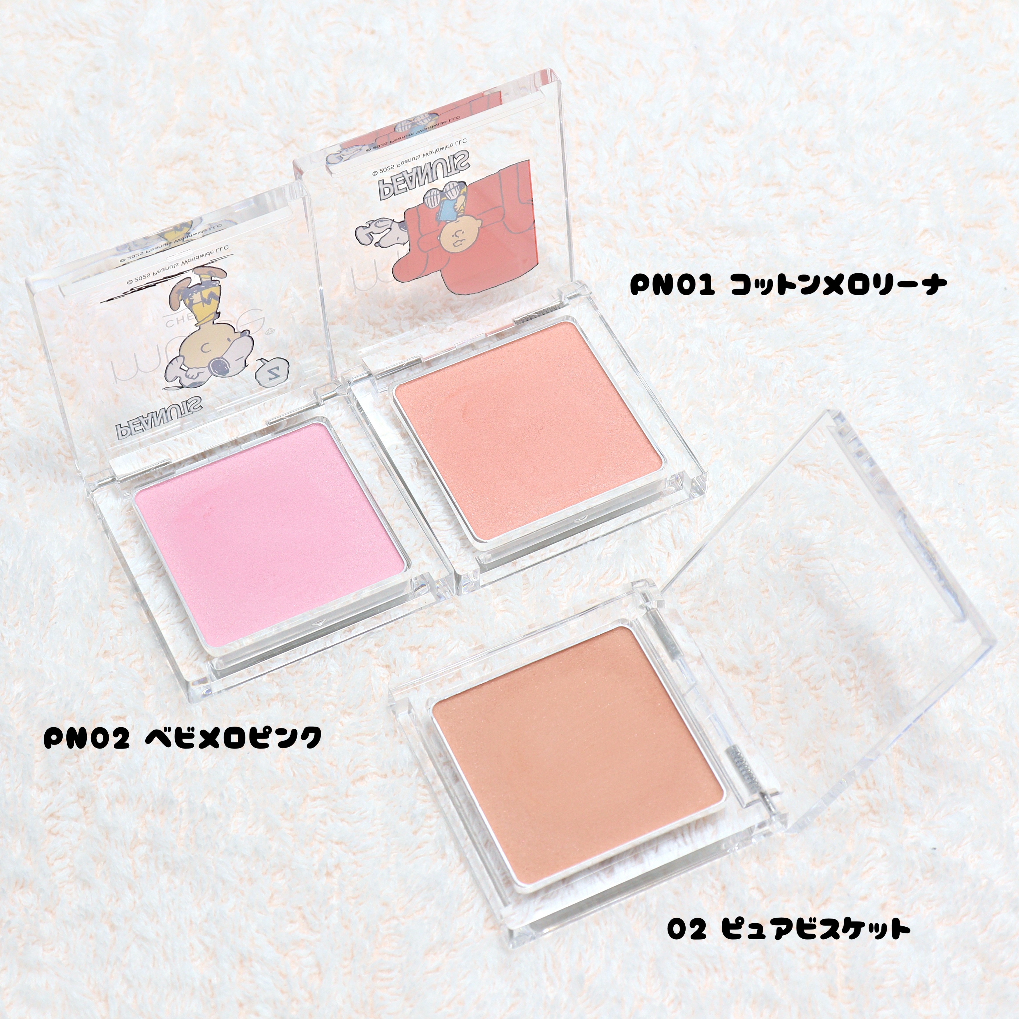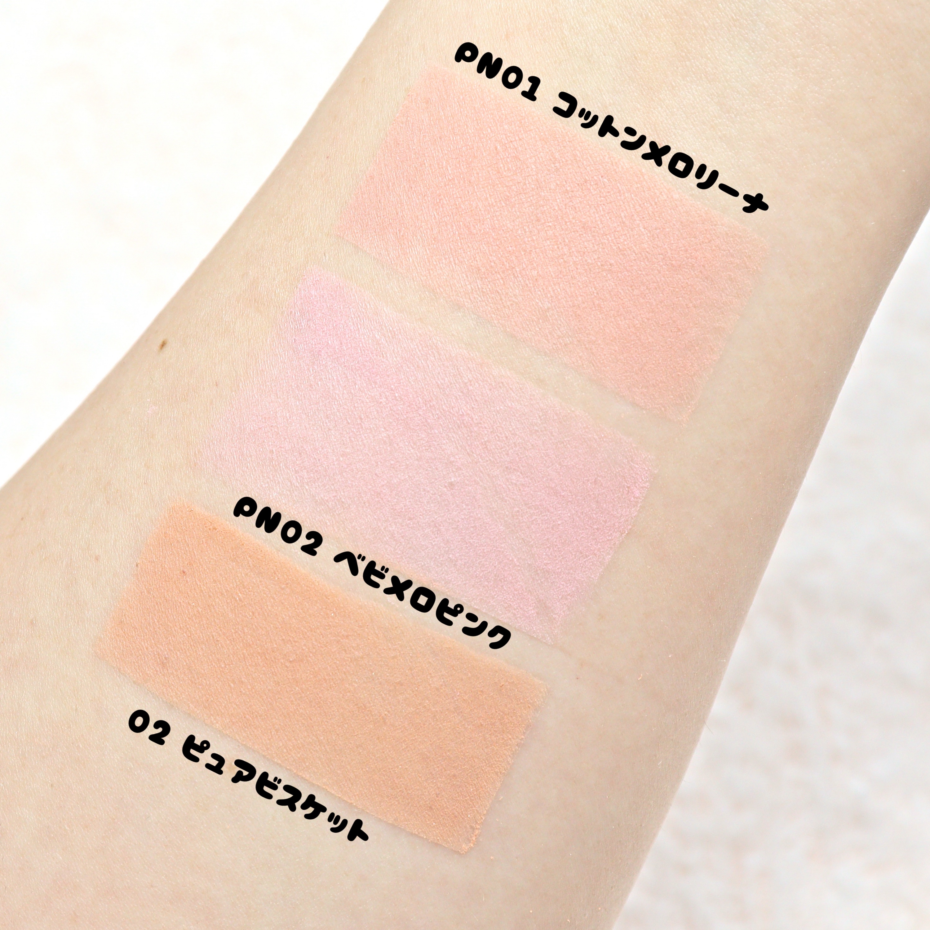 - <02 ピュアビスケット> 合成フルオロフロゴパイト、酸化チタン、窒化ホウ素、シリカ、タルク、ジメチコン、ナイロン-12、パーフルオロヘキシルエチルトリエトキシシラン、水酸化Al、トリ(カプリル酸/カプリン酸)グリセリル、ジフェニルシロキシフェニルトリメチコン、セスキイソステアリン酸ソルビタン、ステアリン酸、ワセリン、クロルフェネシン、デヒドロ酢酸Na、トコフェロール、塩化Al、マイカ、グンジョウ、酸化鉄 <03 ばぶみピンク> タルク、炭酸Ca、ジフェニルシロキシフェニルトリメチコン、シリカ、ジメチコン、ミリスチン酸亜鉛、ヘキサ(ヒドロキシステアリン酸/ステアリン酸/ロジン酸)ジペンタエリスリチル、セタノール、セスキイソステアリン酸ソルビタン、トリエトキシカプリリルシラン、クロルフェネシン、デヒドロ酢酸Na、水酸化Al、トコフェロール、マイカ、酸化チタン、酸化鉄、グンジョウ、赤226 <04 ピュアミルティーピンク(旧:SP01 ピュアミルティーピンク)> タルク、炭酸Ca、シリカ、ジフェニルシロキシフェニルトリメチコン、ジメチコン、ミリスチン酸亜鉛、セタノール、ヘキサ(ヒドロキシステアリン酸/ステアリン酸/ ロジン酸)ジペンタエリスリチル、セスキイソステアリン酸ソルビタン、トリエトキシカプリリルシラン、クロルフェネシン、デヒドロ酢酸Na、トコフェロール、水酸化Al、マイカ、酸化チタン、酸化鉄、赤202、赤226、グンジョウ <PN01 コットンメロリーナ(ピーナッツコラボ)(限定) > タルク、ジフェニルシロキシフェニルトリメチコン、シリカ、ジメチコン、炭酸Ca、ミリスチン酸亜鉛、セタノール、ヘキサ(ヒドロキシステアリン酸/ステアリン酸/ロジン酸)ジペンタエリスリチル、セスキイソステアリン酸ソルビタン、クロルフェネシン、デヒドロ酢酸Na、トコフェロール、水酸化Al、マイカ、酸化鉄、グンジョウ、赤226、黄4、酸化チタン <PN02 ベビメロピンク(ピーナッツコラボ)(限定) > タルク、炭酸Ca、ジフェニルシロキシフェニルトリメチコン、シリカ、ジメチコン、ミリスチン酸亜鉛、ヘキサ(ヒドロキシステアリン酸/ステアリン酸/ロジン酸)ジペンタエリスリチル、セタノール、セスキイソステアリン酸ソルビタン、トリエトキシカプリリルシラン、クロルフェネシン、デヒドロ酢酸Na、トコフェロール、マイカ、酸化チタン、赤226、グンジョウ、酸化鉄、水酸化Al <01 デートローズ> 合成フルオロフロゴパイト、窒化ホウ素、シリカ、酸化チタン、タルク、ジメチコン、ナイロン-12、パーフルオロヘキシルエチルトリエトキシシラン、水酸化Al、トリ(カプリル酸/カプリン酸)グリセリル、ジフェニルシロキシフェニルトリメチコン、セスキイソステアリン酸ソルビタン、ワセリン、ステアリン酸、クロルフェネシン、デヒドロ酢酸Na、トコフェロール、塩化Al、マイカ、酸化鉄、赤226、グンジョウ <SP02 ダスティドライローズ(限定)> タルク、炭酸Ca、シリカ、ジフェニルシロキシフェニルトリメチコン、ジメチコン、ミリスチン酸亜鉛、セタノール、ヘキサ(ヒドロキシステアリン酸/ステアリン酸/ロジン酸)ジペンタエリスリチル、セスキイソステアリン酸ソルビタン、トリエトキシカプリリルシラン、クロルフェネシン、デヒドロ酢酸Na、トコフェロール、マイカ、酸化チタン、酸化鉄、グンジョウ、赤226、赤202
