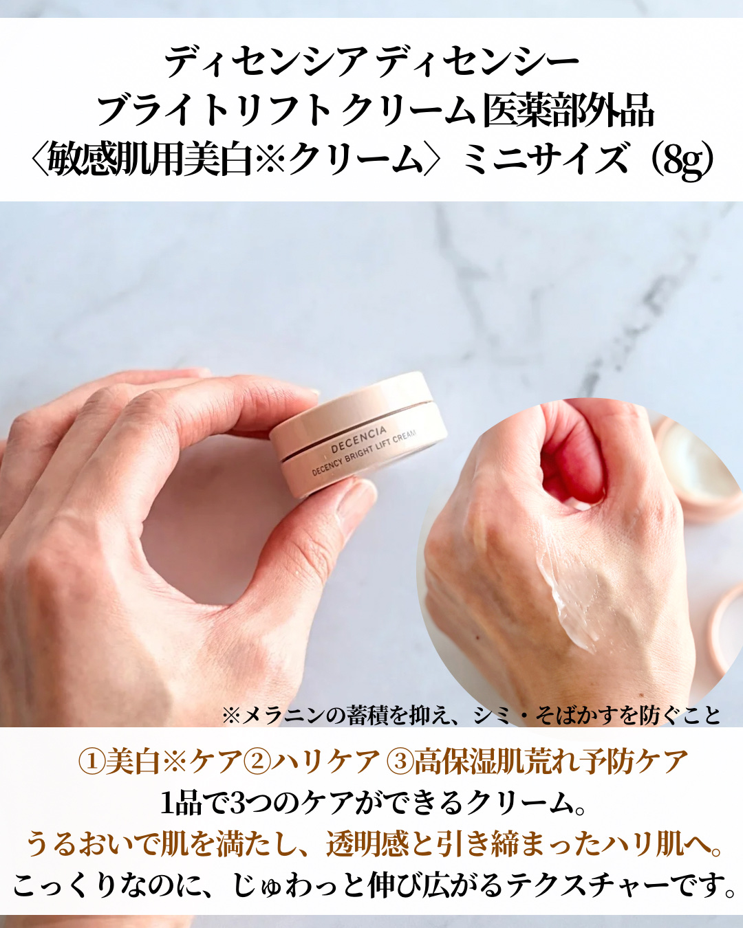 - 【2025クリスマスコフレ】〈数量限定〉 この冬、ディセンシアが贈るスペシャルなキット ・ ディセンシア リンクルO/L コンセントレート 医薬部外品〈敏感肌用シワ改善美容液〉 本品(30mL) ・ ディセンシア ホワイトF/L コンセントレート 医薬部外品〈敏感肌用美白※1美容液〉 ミニサイズ(8mL) ・ ディセンシア モイストS/C コンセントレート 医薬部外品〈敏感肌用美容液〉 ミニサイズ(8mL) ・ ディセンシア ディセンシー ブライトリフト ローション 医薬部外品〈敏感肌用美白※2化粧水〉 ミニサイズ(20mL) ・ ディセンシア ディセンシー ブライトリフト クリーム 医薬部外品〈敏感肌用美白※2クリーム〉 ミニサイズ(8g) ※1 メラニンの生成を抑え、シミ・そばかすを防ぐこと ※2 メラニンの蓄積を抑え、シミ・そばかすを防ぐこと 発売日:2025年11月5日(水)