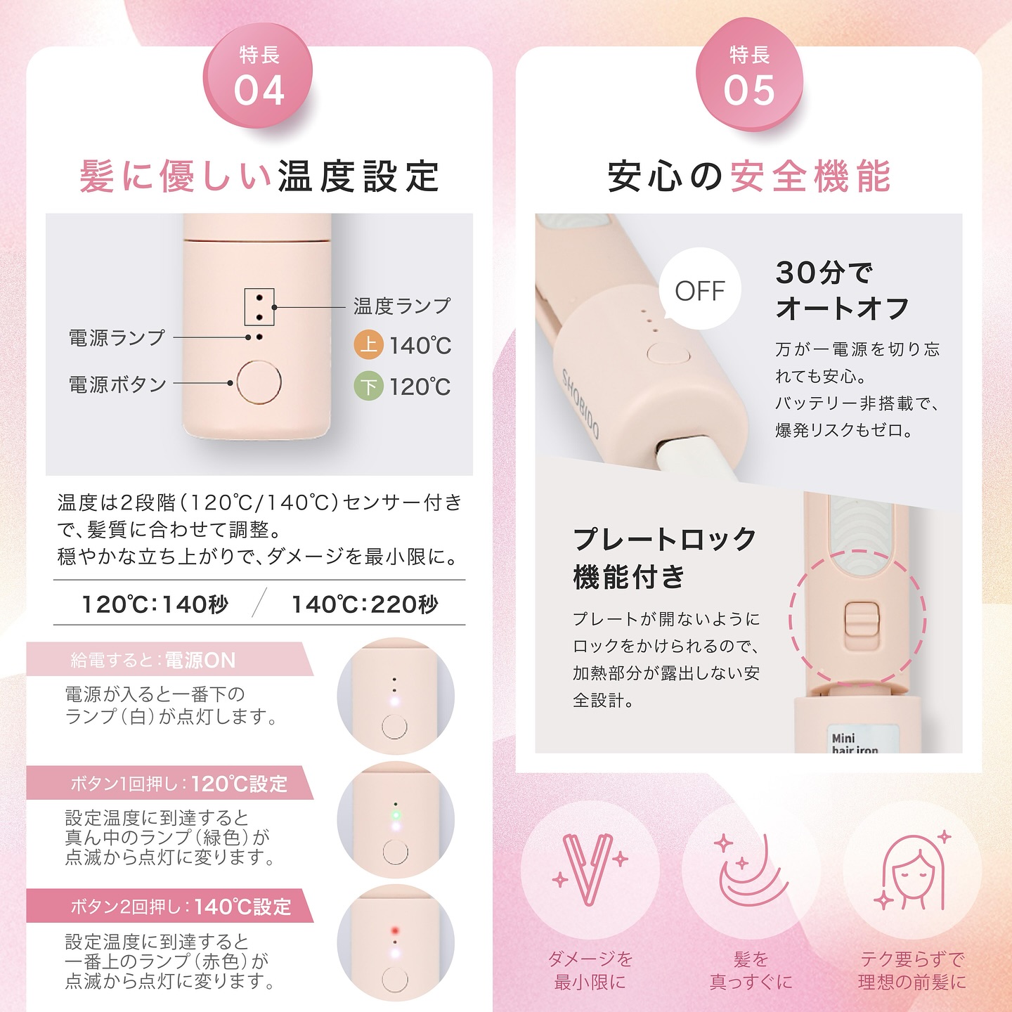 - いつだって前髪が大事。ポーチの中の”お守りアイロン” 手のひらサイズのミニアイロン。 前髪ひとつで、印象チェンジ -どこでも手軽にスタイリング- 付属のUSBケーブルをお手持ちのモバイルバッテリーなどにつないで、どこでも気軽に使えます。 3point ●軽量・ミニサイズ ●髪が傷みにくいセラミックコーティングプレート ●どこでも手軽にスタイリング ■USB給電式(Type C) USB Type-C端子から給電して動作します。 付属のUSBケーブルを、モバイルバッテリーやUSB電源アダプターにつなぐだけで、どこでも手軽に使えます。 ※充電式ではなく、使用中に給電が必要です。 ■軽い・小さい 重さ50g(たまご約1個分) 長さ12×直径2.5cm(手のひらサイズ) ■温度2段階調整 「120℃・140℃」の 2段階調整 可能。 ■セラミックコーティングプレート 髪の摩擦や引っかかりを軽減し、髪を傷みにくくします。 熱を均一に伝え、ムラのないスタイリングが可能です。 ●オートオフ機能付(約30分) ●収納時用キャップ付 【安全上のご注意】 (必ずお守りください) 専用キャップを外してから運転を開始してください。 ※キャップを外さず運転を開始するとキャップ内に熱がこもり高温になるため本体の破損ややけどのおそれがあります。 ※同封の取扱説明書を必ずご確認の上ご使用ください。