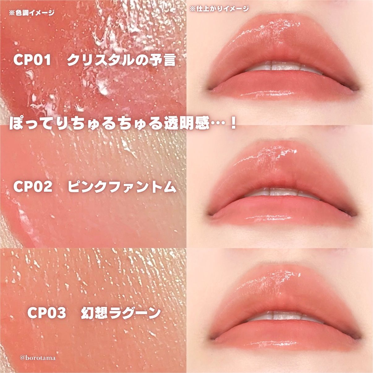 - <CP01 クリスタルの予言> テトライソステアリン酸ジペンタエリスリチル、デカイソステアリン酸ポリグリセリル-10、オクチルドデカノール、リンゴ酸ジイソステアリル、ラウロイルグルタミン酸ジ(フィトステリル/オクチルドデシル)、ビスアルキル(C16-18)グリセリルウンデシルジメチコン、トリ(カプリル酸/カプリン酸)グリセリル、水添ポリイソブテン、ラウロイルグルタミン酸ジ(オクチルドデシル/フィトステリル/ベヘニル)、パラフィン、ダイマージリノール酸(フィトステリル/イソステアリル/セチル/ステアリル/ベヘニル)、合成ワックス、ホホバ種子油、マイクロクリスタリンワックス、ジステアルジモニウムヘクトライト、水添マイクロクリスタリンワックス、炭酸プロピレン、トコフェロール、パルミチン酸デキストリン、オリーブ果実油、アーモンド油、(エチレン/プロピレン)コポリマー、ポリエチレン、ヒドロキシステアリン酸エチルヘキシル、ヒアルロン酸Na、フェノキシエタノール、(+/-)セルロース、マイカ、ラウロイルアスパラギン酸Na、ラウロイルリシン、塩化亜鉛、酸化チタン、酸化鉄、水酸化Al、硫酸Ba、トリイソステアリン酸イソプロピルチタン、トリエトキシカプリリルシラン、黄4、黄5、青1、赤201、赤202 <CP02 ピンクファントム> テトライソステアリン酸ジペンタエリスリチル、デカイソステアリン酸ポリグリセリル-10、オクチルドデカノール、リンゴ酸ジイソステアリル、ラウロイルグルタミン酸ジ(フィトステリル/オクチルドデシル)、ビスアルキル(C16-18)グリセリルウンデシルジメチコン、トリ(カプリル酸/カプリン酸)グリセリル、水添ポリイソブテン、ラウロイルグルタミン酸ジ(オクチルドデシル/フィトステリル/ベヘニル)、パラフィン、ダイマージリノール酸(フィトステリル/イソステアリル/セチル/ステアリル/ベヘニル)、合成ワックス、ホホバ種子油、マイクロクリスタリンワックス、ジステアルジモニウムヘクトライト、水添マイクロクリスタリンワックス、炭酸プロピレン、トコフェロール、パルミチン酸デキストリン、オリーブ果実油、アーモンド油、(エチレン/プロピレン)コポリマー、ポリエチレン、ヒドロキシステアリン酸エチルヘキシル、ヒアルロン酸Na、フェノキシエタノール、(+/-)セルロース、マイカ、ラウロイルアスパラギン酸Na、ラウロイルリシン、塩化亜鉛、酸化チタン、酸化鉄、水酸化Al、硫酸Ba、トリイソステアリン酸イソプロピルチタン、トリエトキシカプリリルシラン、黄4、黄5、青1、赤201、赤202 <CP03 幻想ラグーン> テトライソステアリン酸ジペンタエリスリチル、デカイソステアリン酸ポリグリセリル-10、オクチルドデカノール、リンゴ酸ジイソステアリル、ラウロイルグルタミン酸ジ(フィトステリル/オクチルドデシル)、ビスアルキル(C16-18)グリセリルウンデシルジメチコン、トリ(カプリル酸/カプリン酸)グリセリル、水添ポリイソブテン、ラウロイルグルタミン酸ジ(オクチルドデシル/フィトステリル/ベヘニル)、パラフィン、ダイマージリノール酸(フィトステリル/イソステアリル/セチル/ステアリル/ベヘニル)、合成ワックス、ホホバ種子油、マイクロクリスタリンワックス、ジステアルジモニウムヘクトライト、水添マイクロクリスタリンワックス、炭酸プロピレン、トコフェロール、パルミチン酸デキストリン、オリーブ果実油、アーモンド油、(エチレン/プロピレン)コポリマー、ポリエチレン、ヒドロキシステアリン酸エチルヘキシル、ヒアルロン酸Na、フェノキシエタノール、(+/-)セルロース、マイカ、ラウロイルアスパラギン酸Na、ラウロイルリシン、塩化亜鉛、酸化チタン、酸化鉄、水酸化Al、硫酸Ba、トリイソステアリン酸イソプロピルチタン、トリエトキシカプリリルシラン、黄4、黄5、青1、赤201、赤202