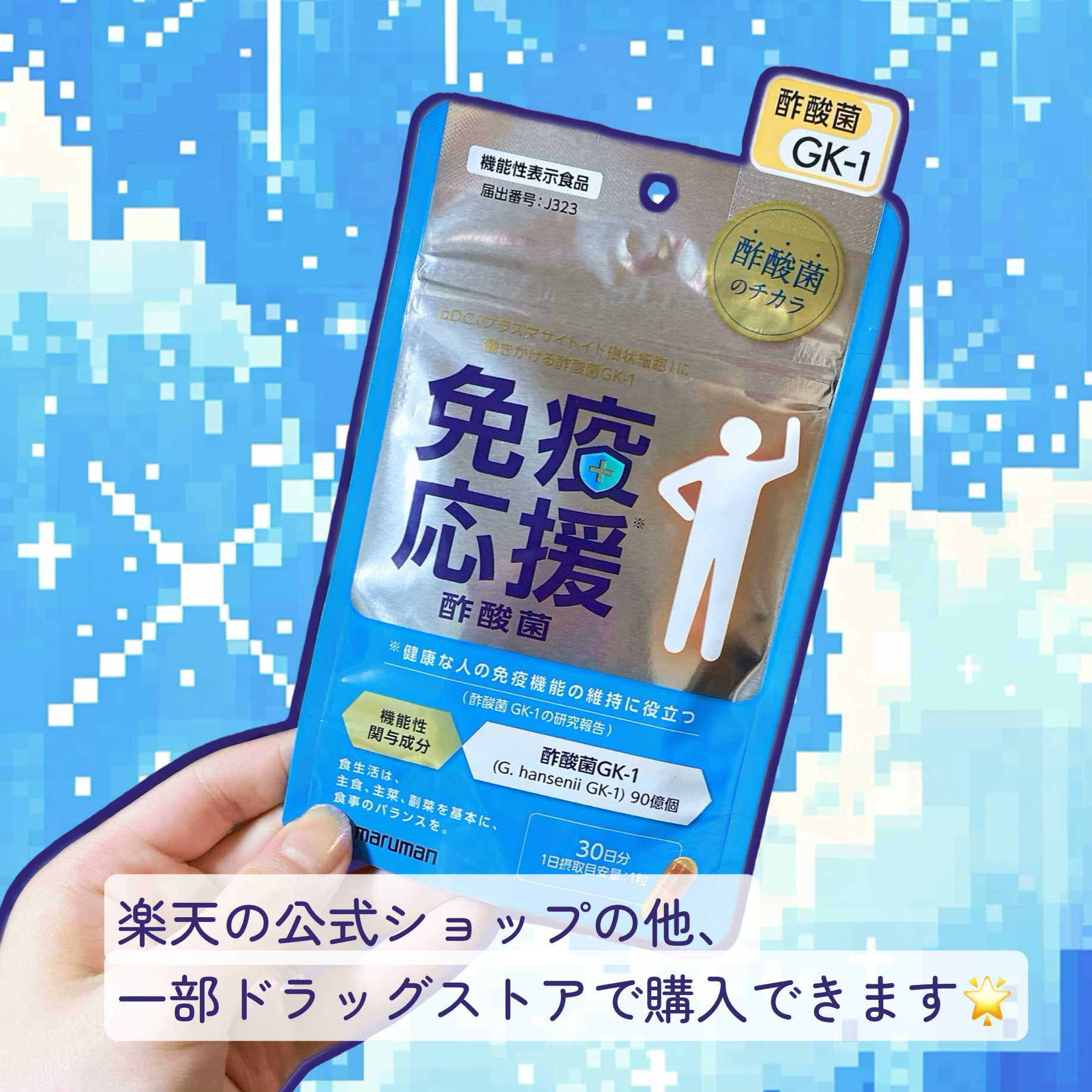 マルマンH&B株式会社・免疫応援酢酸菌30日分酢酸菌GK-1に注目・健康な人の免疫機能の維持に役立つことが報告されている成分【酢酸菌GK-1】を小さな1粒に約90億個をぎゅっと配合🪄毎日の食事だけでは摂りにくい成分を手軽にチャージすることで健...