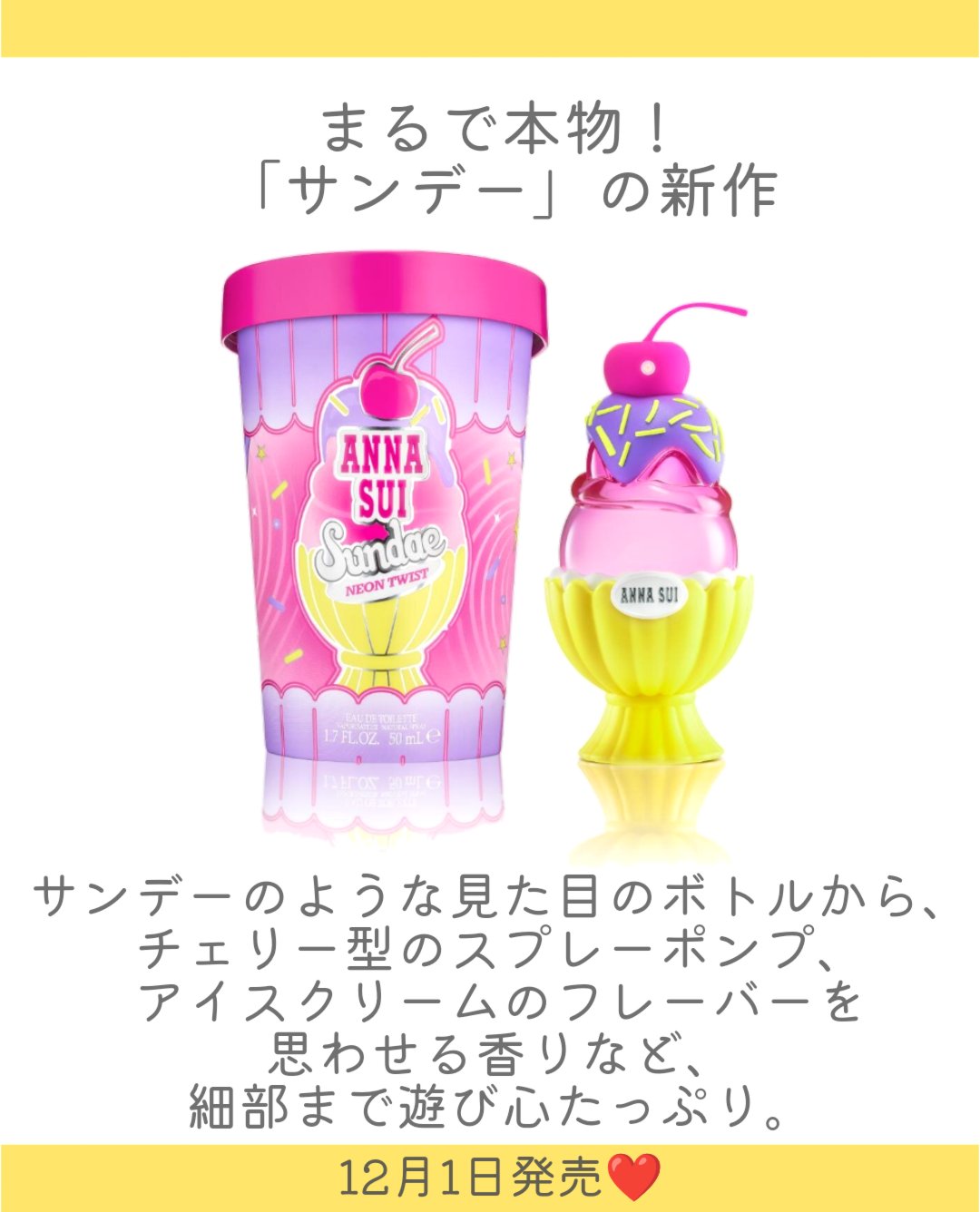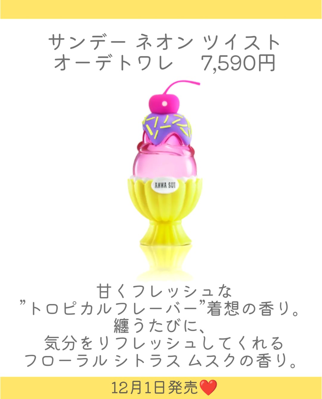 - 【天真爛漫 にアイスを頬張るみた いに。Very Sweetであざやかトロピカル なサンデー】 デザイナー アナ・スイが大好きなアイスクリームとロックな世界観を存分に味わえる 『アナ スイ サンデー ネオン ツイスト オーデトワレ』 合言葉は、キャンディ&ロック! とびきり甘くて無邪気なのにおもいきりエッジがきいて尖ってる。 このエネルギッシュな香りを武器にもっと自由にGOING MY WAYでいこう。 <FRAGRANCE> フローラル シトラス ムスク 自由奔放なスピリッツを。フレッシュでエネルギッシュな魅惑漂う香り TOP:コーラルハイビスカス・ベルガモット・グレープフルーツ MIDDLE:グアバアイスクリーム・ネロリ・ジャスミン BASE:ムスク・ブロンドウッド・アンバー ■2025 年 12 月 1 日 ( 月 ) 発売