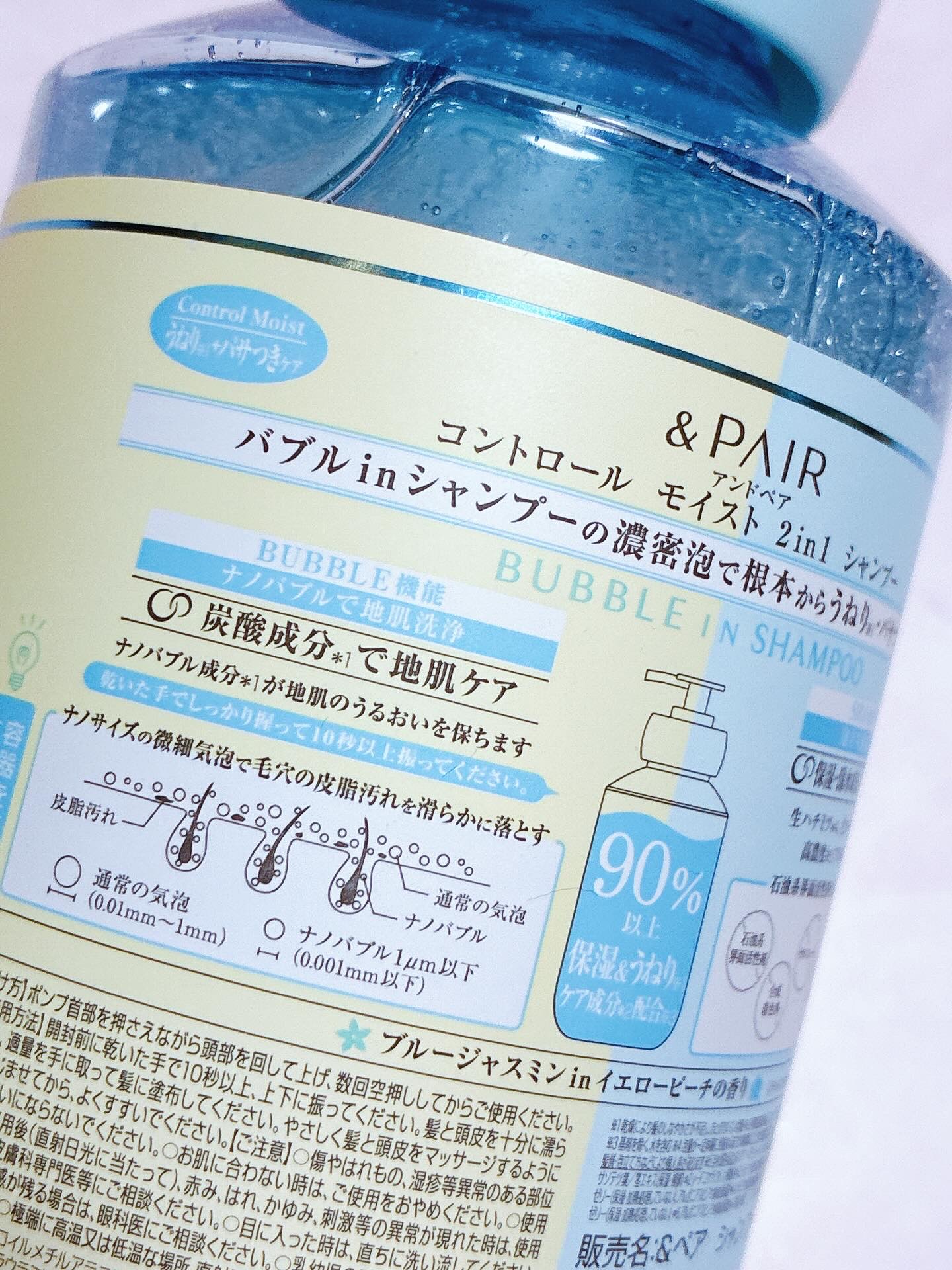 - &PAIRは「タイパ美容」に着目し、1本で2つの機能を持ち合わせたヘアケアブランドです。 コントロール モイストシリーズはうねり※1とパサつきを同時にケアし、しっとりな仕上がりに導きます。 シャンプーにはナノバブルパーツが採用されており、本体を振ることでナノバブルを発生させることができます。 ナノサイズの微細な泡で毛穴の皮脂汚れを滑らかに洗い流します。 ヘアトリートメントは導入ブースター成分*1で保湿成分の浸透をサポートし、 髪のパサつきに浸透保湿ケアができる導入ブースター機能のあるヘアトリートメント。 製品の90%以上が保湿&うねり※1ケア成分*2で構成し※2、指通り滑らかなしっとり髪へ導きます。 石油系洗浄成分不使用・パラベン不使用・動物実験不実施(製品として)・合成着色料不使用・サルフェート不使用(ラウレス硫酸Na)・鉱物油不使用 ※1 乾燥により髪のしなやかさが不足し、まとまりにくい状態 ※2 基剤を除く、水を含む *1 アルギニン、加水分解ケラチン(羊毛)、加水分解ヒアルロン酸(全て保湿) *2 γードコサラクトン(補修)