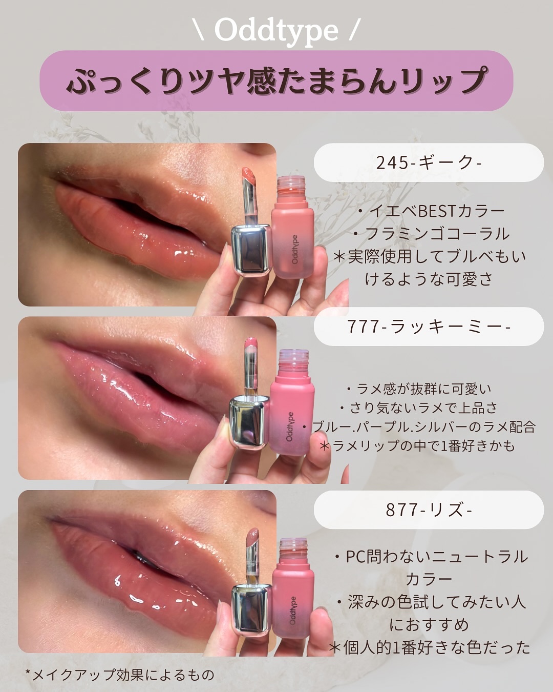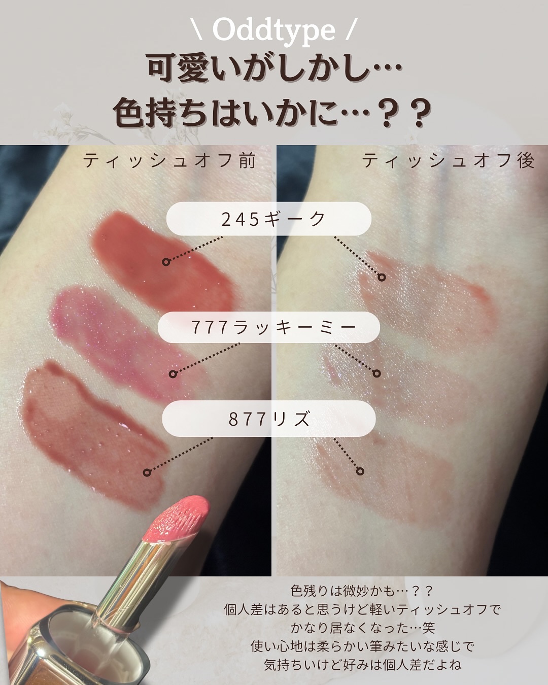 🩷Oddtypeアンシーンバルーンティント・245Geek・777LuckyMe・877Rizz𖤣𖥧𖥣。𖡼.𖤣𖥧𖡼.𖤣𖥧⚘𖤣𖥧𖥣。𖡼.𖤣𖥧𖡼.𖤣𖥧⚘アンシーンバルーンティントの“ぷるん感”がほんとにかわいいの🥹💋形状記憶ジェルがスルッと伸びて...