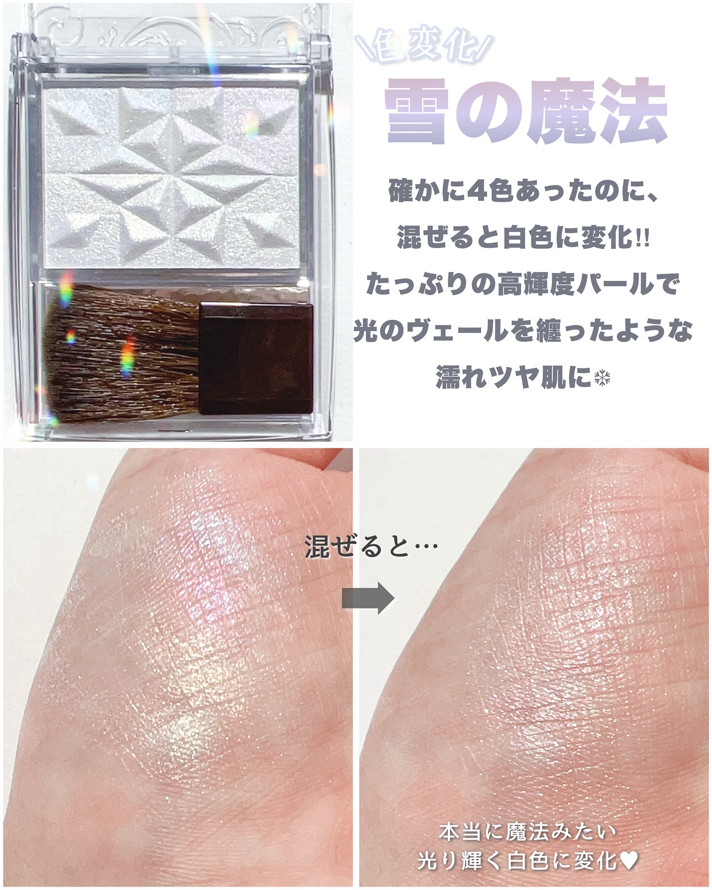 大人気セザンヌハイライト🤍頬に初雪の輝き❄️︎︎⟡𝗖𝗘𝗭𝗔𝗡𝗡𝗘𝗣𝗲𝗮𝗹𝗚𝗹𝗼𝘄𝗛𝗶𝗴𝗵𝗹𝗶𝗴𝗵𝘁𝗦𝗣𝟯スノーファンタジー¥847買えてました♡一見真っ白なパウダーに見えますが透明感たっぷりな4色💛💚🩵🩷4色をミックスし肌に塗ると、スノー...
