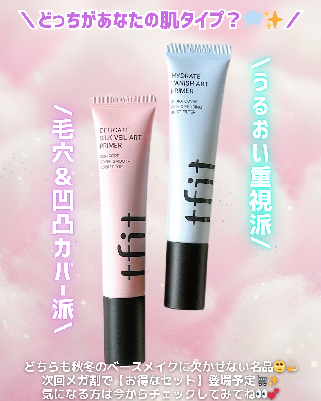 ♡@ame.k.cosme♡♡🤍TFIT@tfit.japan♡♡デリケートシルクヴェールアートプライマーハイドレートバニッシュアートプライマー♡♡✨\秋冬にぴったりのおすすめプライマー/✨乾燥やメイク崩れが気になる季節にベースメイクの密着感...