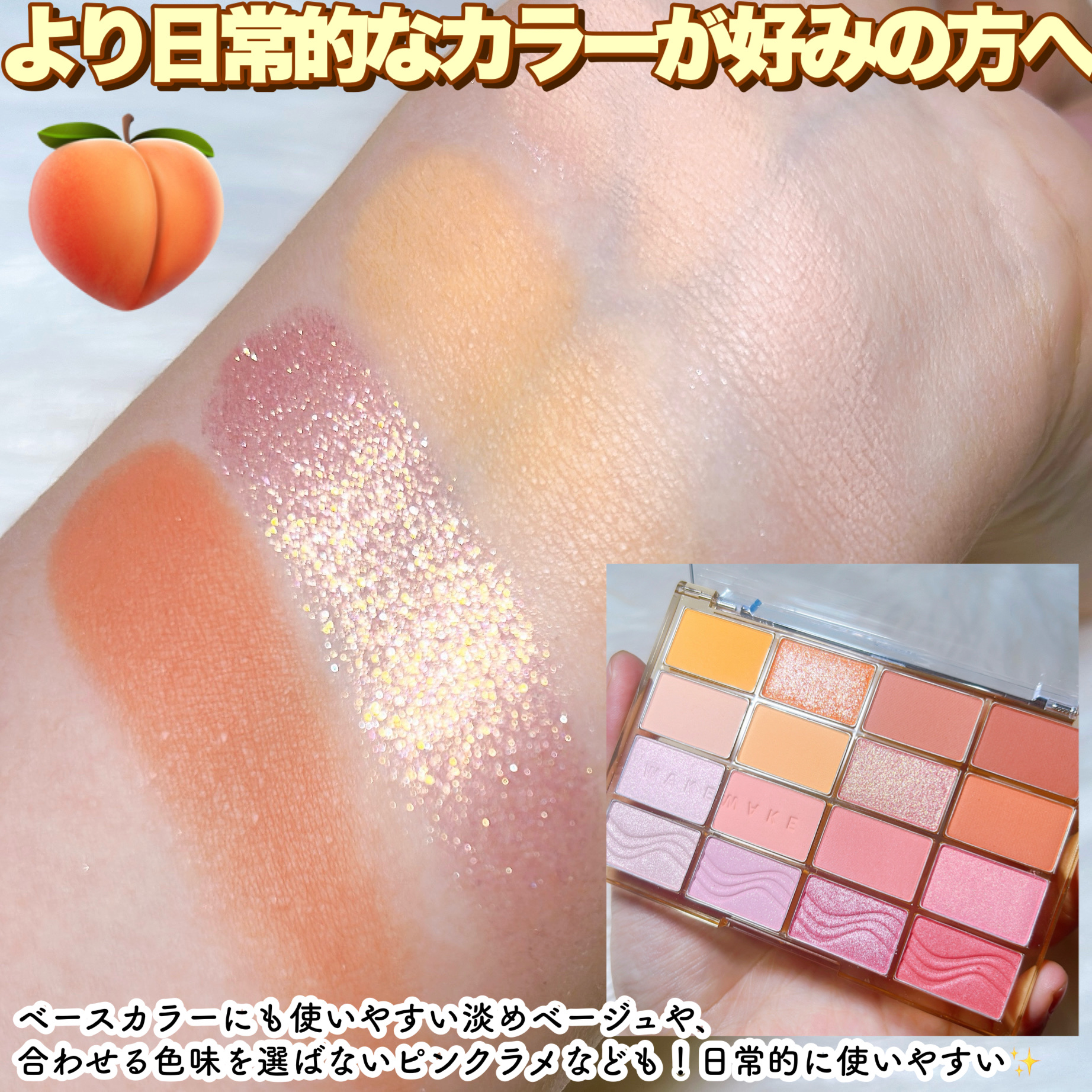 マットはかなりくすんだ色で、暗めのメイクに仕上がりがちに🤎 ツヤ感が大事だと言われるイエベ春でも、スモーキーメイク出来るんだ…!と思わせてくれたパレット。 愛して止まないミルクラテ、絶妙な柔らかベージュに透明感たっぷりのラメ✨️ 全色ラメ入りですが、真ん中2色のくすみと黄みが強く、どんよりした目元に…🥲 コーラルは大好きなんですが、このパレットは3滴白みを足したような色で、発色も弱くまぶたにも乗りづらく、かなり色白さんでないと使えない気がします…🥲 手持ちの中で1番黄み強いですが、1番完成度の高いです💕