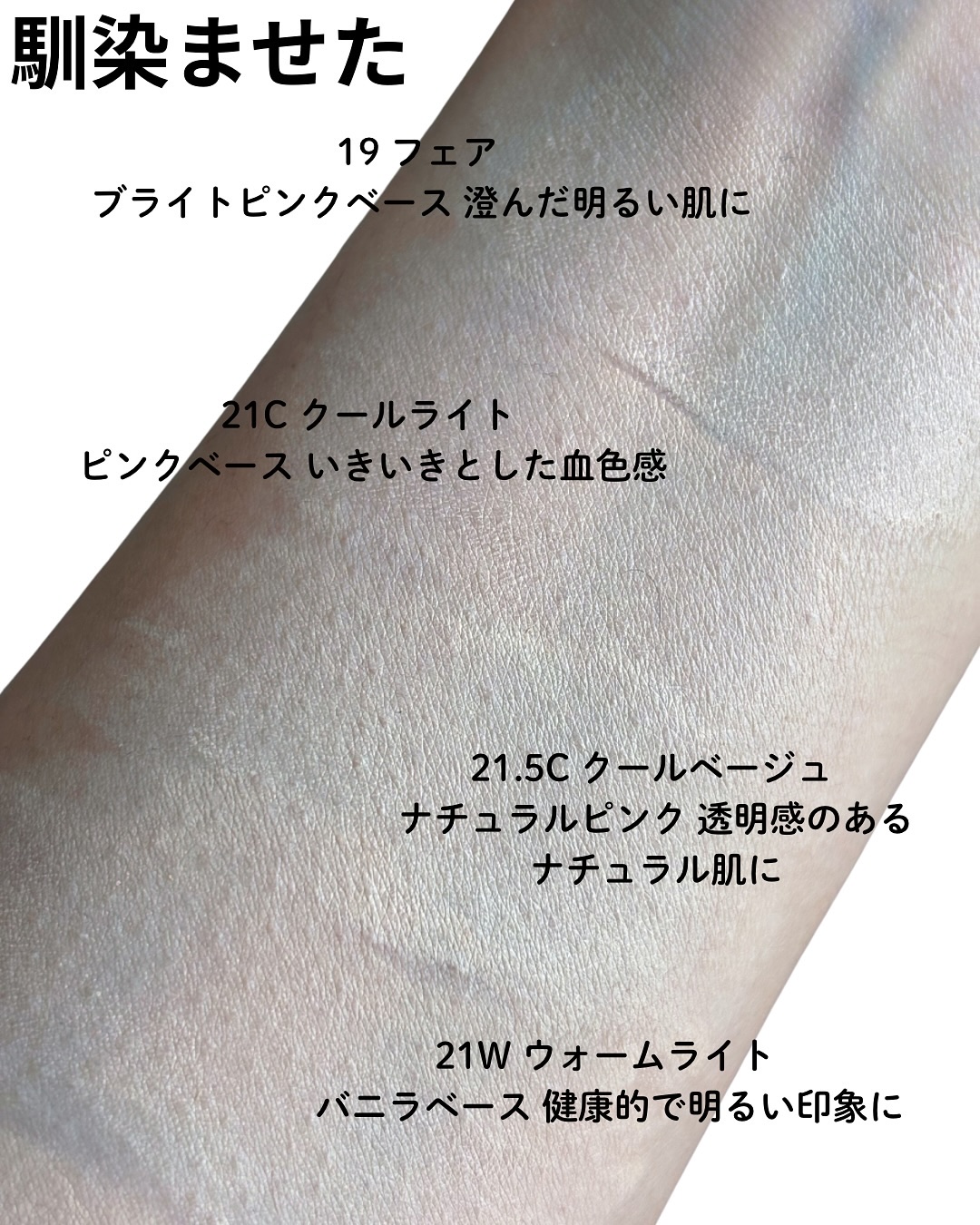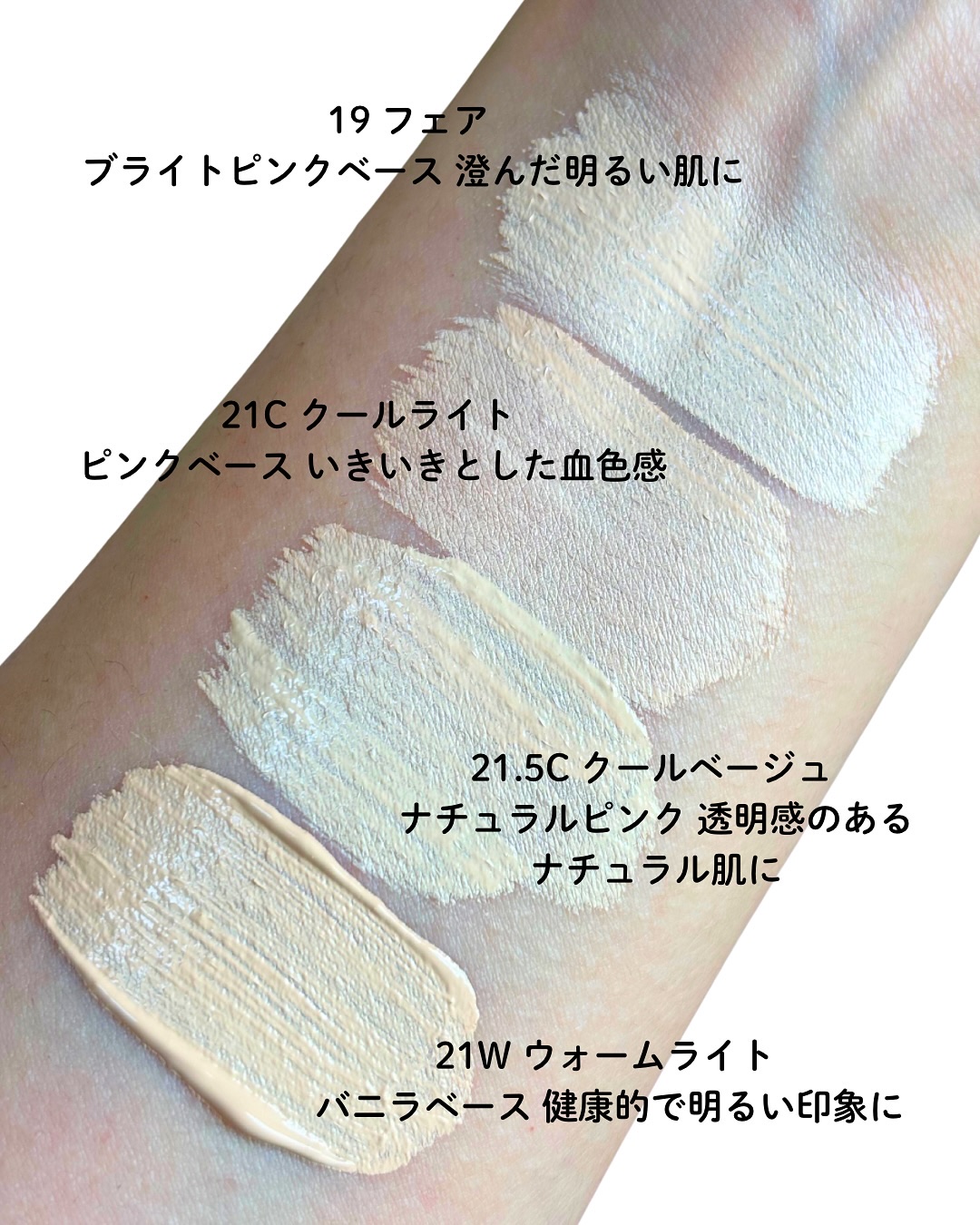 - <19 フェア> 精製水、シクロペンタシロキサン、酸化チタン、ブチレングリコール、イソドデカン、メチルプロパンジオール、ブチレングリコールジカプリレート/ジカプレート、セチルPEG/PPG-10/1ジメチコン、ナイアシンアミド、PVP、C12-15アルキルベンゾエート、スクワラン、ポリグリセリル-4アイソステアレート、マイカ、硫酸マグネシウム、アクリレーツ/ステアリルアクリレート/ジメチコンメタクリレートコポリマー、トリメチルシロキシシリケート、黄色酸化鉄、ジステアジモニウムヘクトライト、ビニルジメチコン/メチコンシルセスキオキサンクロスポリマー、シリカ、水酸化アルミニウム、カプリリルグリコール、パルミチン酸、トリエトキシカプリリルシラン、ステアリン酸、赤色酸化鉄、アクリレーツ/ジメチコンコポリマー、エチルヘキシルグリセリン、メチコン、アデノシン、黒色酸化鉄、グリセリン、オリーブ油、ペンタエリスリチルテトラ-di-t-ブチルヒドロキシヒドロシンナメート、1,2-ヘキサンジオール、水添レシチン、カラスムギタンパクエキス、セラミドNS、セラミドNP、加水分解ヒアルロン酸Na、セラミドAP、セラミドEOP <21 ウォームライト> 精製水、シクロペンタシロキサン、酸化チタン、ブチレングリコール、イソドデカン、メチルプロパンジオール、ブチレングリコールジカプリレート/ジカプレート、セチルPEG/PPG-10/1ジメチコン、ナイアシンアミド、PVP、C12-15アルキルベンゾエート、スクワラン、ポリグリセリル-4アイソステアレート、硫酸マグネシウム、アクリレーツ/ステアリルアクリレート/ジメチコンメタクリレートコポリマー、トリメチルシロキシシリケート、マイカ、黄色酸化鉄、ジステアジモニウムヘクトライト、ビニルジメチコン/メチコンシルセスキオキサンクロスポリマー、シリカ、水酸化アルミニウム、カプリリルグリコール、トリエトキシカプリリルシラン、パルミチン酸、ステアリン酸、アクリレーツ/ジメチコンコポリマー、赤色酸化鉄、黒色酸化鉄、エチルヘキシルグリセリン、アデノシン、メチコン、グリセリン、オリーブ油、ペンタエリスリチルテトラ-di-t-ブチルヒドロキシヒドロシンナメート、1,2-ヘキサンジオール、水添レシチン、カラスムギタンパクエキス、セラミドNS、セラミドNP、加水分解ヒアルロン酸Na、セラミドAP、セラミドEOP <21 クールライト> 精製水、シクロペンタシロキサン、酸化チタン、ブチレングリコール、イソドデカン、メチルプロパンジオール、ブチレングリコールジカプリレート/ジカプレート、セチルPEG/PPG-10/1ジメチコン、ナイアシンアミド、PVP、C12-15アルキルベンゾエート、スクワラン、ポリグリセリル-4アイソステアレート、硫酸マグネシウム、アクリレーツ/ステアリルアクリレート/ジメチコンメタクリレートコポリマー、トリメチルシロキシシリケート、マイカ、黄色酸化鉄、ジステアジモニウムヘクトライト、ビニルジメチコン/メチコンシルセスキオキサンクロスポリマー、シリカ、水酸化アルミニウム、カプリリルグリコール、トリエトキシカプリリルシラン、パルミチン酸、ステアリン酸、赤色酸化鉄、アクリレーツ/ジメチコンコポリマー、黒色酸化鉄、エチルヘキシルグリセリン、アデノシン、メチコン、グリセリン、オリーブ油、ペンタエリスリチルテトラ-di-t-ブチルヒドロキシヒドロシンナメート、1,2-ヘキサンジオール、水添レシチン、カラスムギタンパクエキス、セラミドNS、セラミドNP、加水分解ヒアルロン酸Na、セラミドAP、セラミドEOP <22 アイボリー> 精製水、シクロペンタシロキサン、酸化チタン、ブチレングリコール、イソドデカン、メチルプロパンジオール、ブチレングリコールジカプリレート/ジカプレート、セチルPEG/PPG-10/1ジメチコン、ナイアシンアミド、PVP、C12-15アルキルベンゾエート、スクワラン、ポリグリセリル-4アイソステアレート、黄色酸化鉄、硫酸マグネシウム、アクリレーツ/ステアリルアクリレート/ジメチコンメタクリレートコポリマー、トリメチルシロキシシリケート、ジステアジモニウムヘクトライト、ビニルジメチコン/メチコンシルセスキオキサンクロスポリマー、シリカ、マイカ、水酸化アルミニウム、カプリリルグリコール、トリエトキシカプリリルシラン、赤色酸化鉄、パルミチン酸、ステアリン酸、アクリレーツ/ジメチコンコポリマー、黒色酸化鉄、エチルヘキシルグリセリン、アデノシン、メチコン、グリセリン、オリーブ油、ペンタエリスリチルテトラ-di-t-ブチルヒドロキシヒドロシンナメート、1,2-ヘキサンジオール、水添レシチン、カラスムギタンパクエキス、セラミドNS、セラミドNP、加水分解ヒアルロン酸Na、セラミドAP、セラミドEOP <23 ナチュラル> 精製水、シクロペンタシロキサン、酸化チタン、ブチレングリコール、イソドデカン、メチルプロパンジオール、ブチレングリコールジカプリレート/ジカプレート、セチルPEG/PPG-10/1ジメチコン、ナイアシンアミド、PVP、C12-15