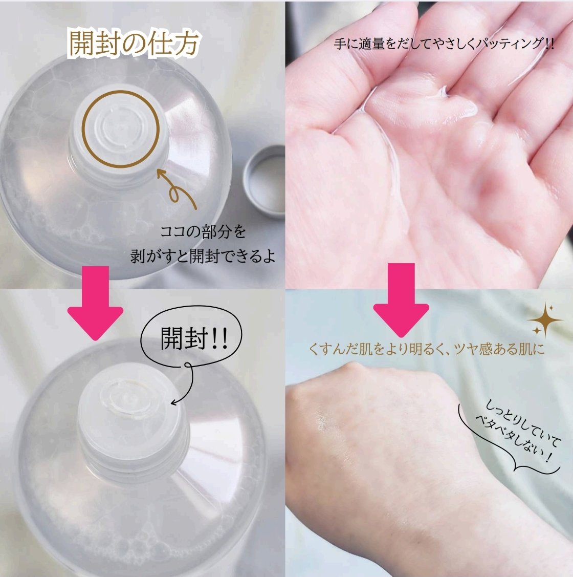 - ビタミンC※3 やナイアシンアミド※4 配合で、お肌に透明感※2 を与え、キメの整ったツヤ肌へ導くトナー。さらりとした水のようなテクスチャーで、べたつかずさっぱりとした使用感。500mlの大容量なので、全身にたっぷりご使用いただけます。 ※2 キメの整った肌印象のこと ※3 アスコルビン酸(皮膚コンディショニング剤)※4 皮膚コンディショニング剤 ※5 皮膚コンディショニング剤
