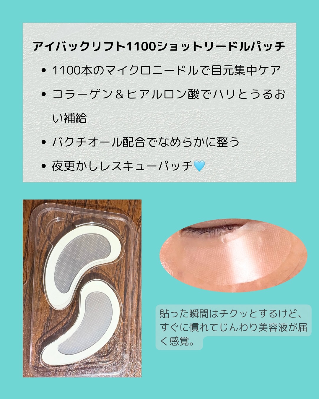 - 気になる目元の肌にハリを与える 肌にすっとなじむ美容保湿成分配合 パッチ1回で1,100回のニードルショット*1 長く貼ってもやさしい使い心地!(韓国内にて低刺激テスト完了*2) 目元だけでなく集中ケアが必要な部位にもお使いいただけます。 *1角質層まで *2全ての方に皮膚刺激が発生しないということではありません