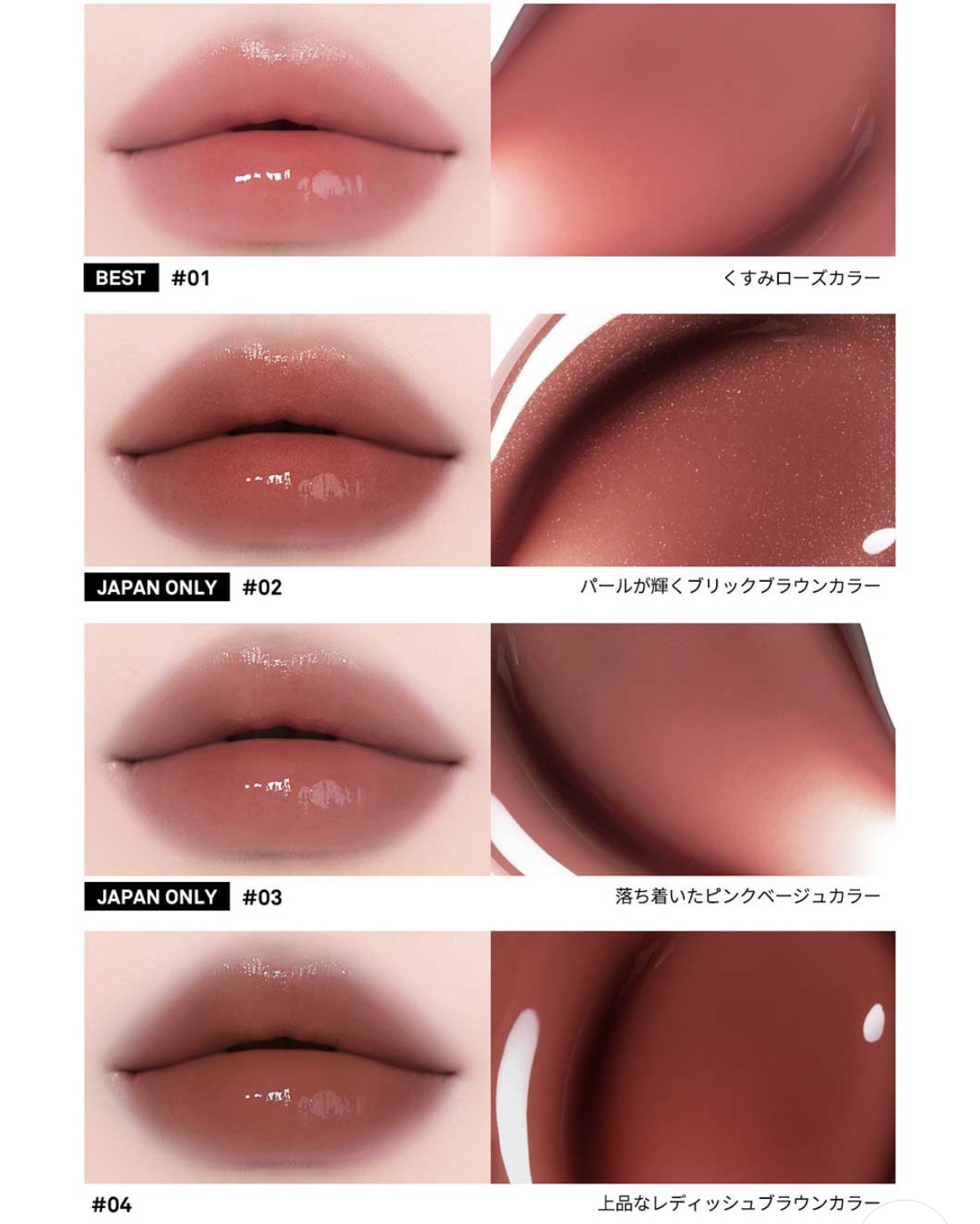 - 軽やかな塗り心地とクリアな仕上がりで“水光ツヤ唇”を叶えるグロウリップティント ●内側からあふれ出るような“水光ツヤ”と美しい発色 うるおいのあるオイル膜が時間とともに表面に浮かび上がることで、光沢感がアップし、ナチュラルに発色。 透明感のあるツヤと美しい発色が長時間続きます。 ●ベタつきのない軽やかなつけ心地 保湿力を感じられる仕上がりながらベタつき感のない軽やかなつけ心地で、デイリー使いにもぴったりです。 ●こだわり抜いた全 8 色のカラーバリエーション その日の気分やシーンに合わせて選べる全8色の豊富なカラー展開。 韓国で人気の5色に、日本限定の3色をプラスした特別なラインナップ。 違うカラーをレイヤリングすれば、自分だけのニュアンスリップをお楽しみいただけます。 ●持っているだけで気分が上がるハート型のパッケージ 【取扱店】公式オンラインストア、楽天市場公式ショップ、Qoo10、Amazon、ロフト、ロフトネットストア、ハンズ、ショップイン、アットコスメ、R.O.U、京王アートマン、アインズ&トルぺ、イオン、チャーリー(一部店舗を除く)