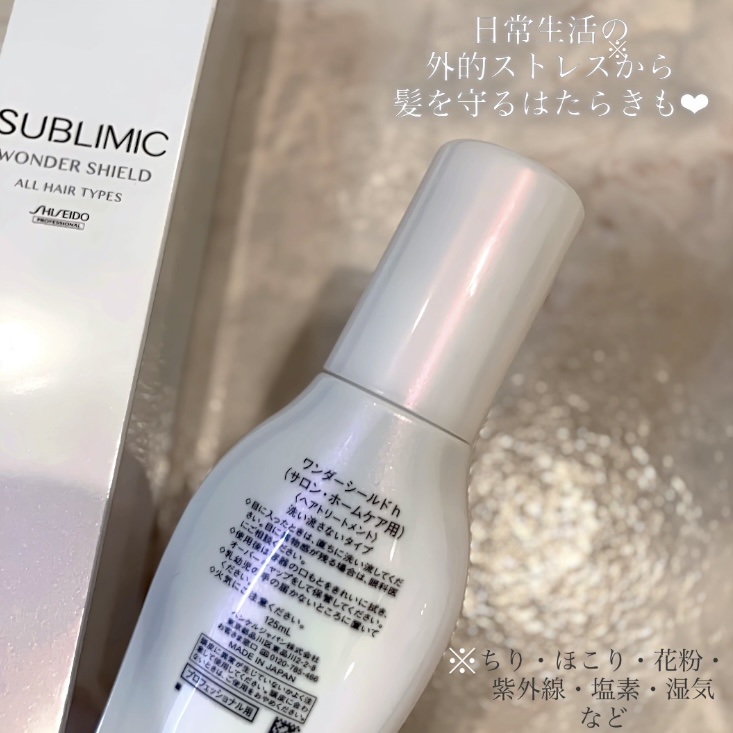 3日に1回、自宅に居ながらスペシャルケアができる、洗い流さないトリートメントを使ってみました🫶🤍サブリミックワンダーシールド容量:125mLシールド成分がドライヤーやアイロンの熱と反応し外的ストレス*から髪を守る特徴があるそう✍️*ちり・ほこ...