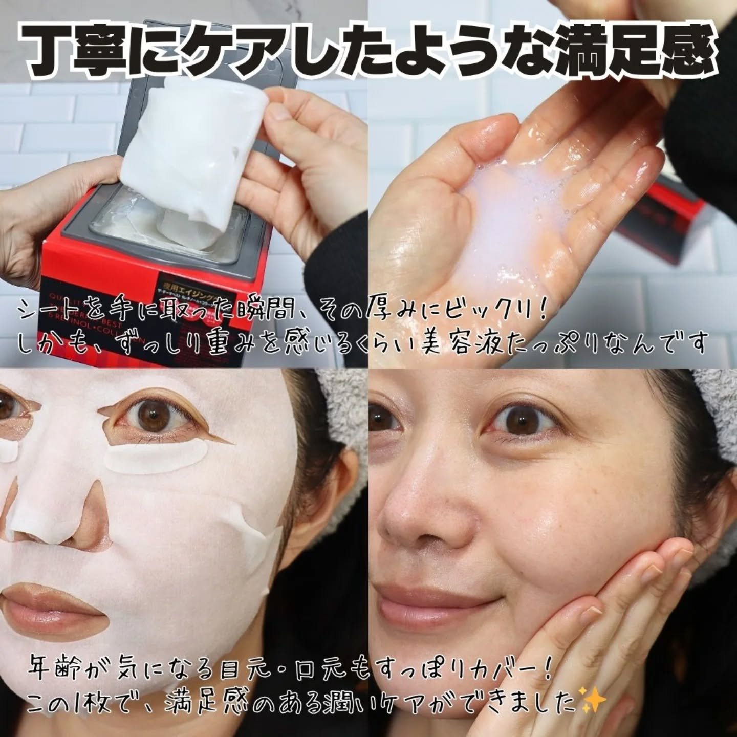 | 美容液がたっぷりひたひたに染み込んでいて、みずみずしくしっとりした使用感です! | 詳細を見る |