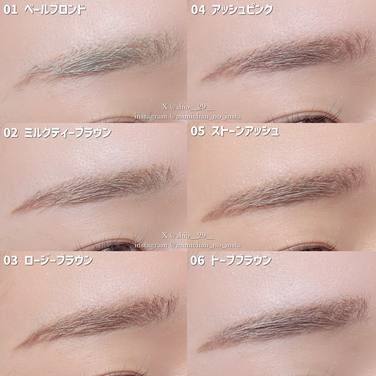 - 薄いタッチでもムラを防いで高発色し、ナチュラルからブリーチまで幅広いカラーを揃え、素早くフィクシングしてにじみにくく、スキニーブラシで繊細に仕上げられるアイブロウカラー