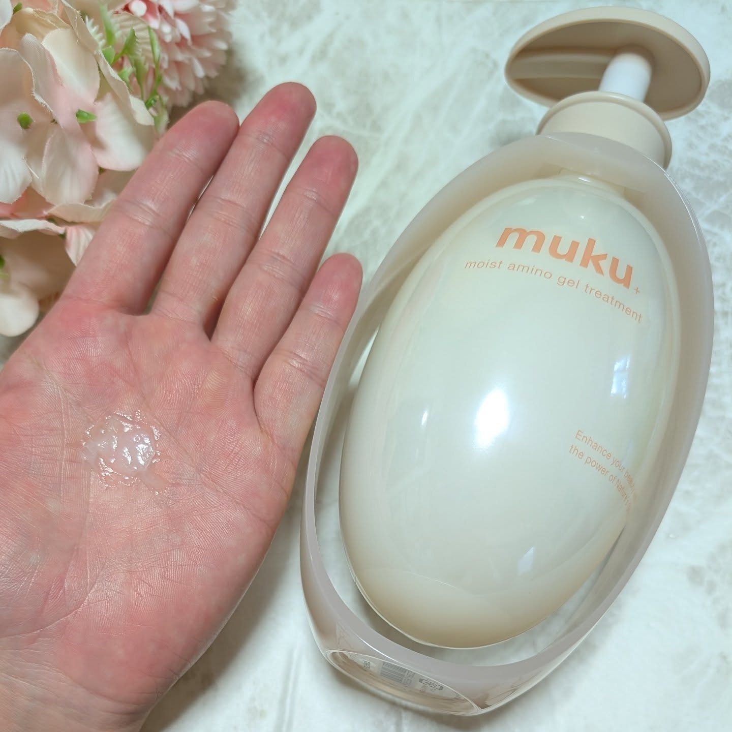 ムク+ モイストアミノジェルシャンプームク+ モイストアミノジェルトリートメント@muku_p_jpうすーいピンクのパッケージカラーも可愛いだけじゃなくて、コロンとしたボトルも可愛い💓シャンプーは、手のひらで白くなるまで5秒ぐらい揉み込むこと...