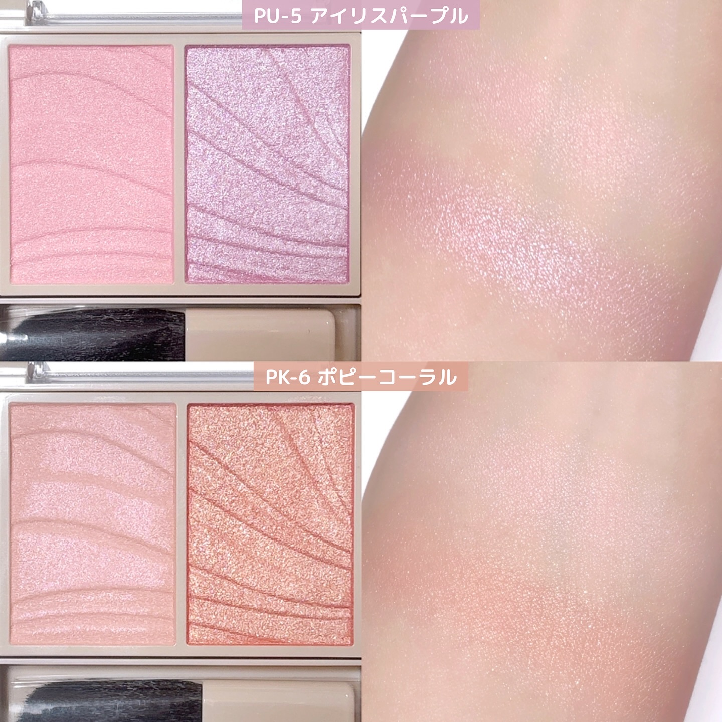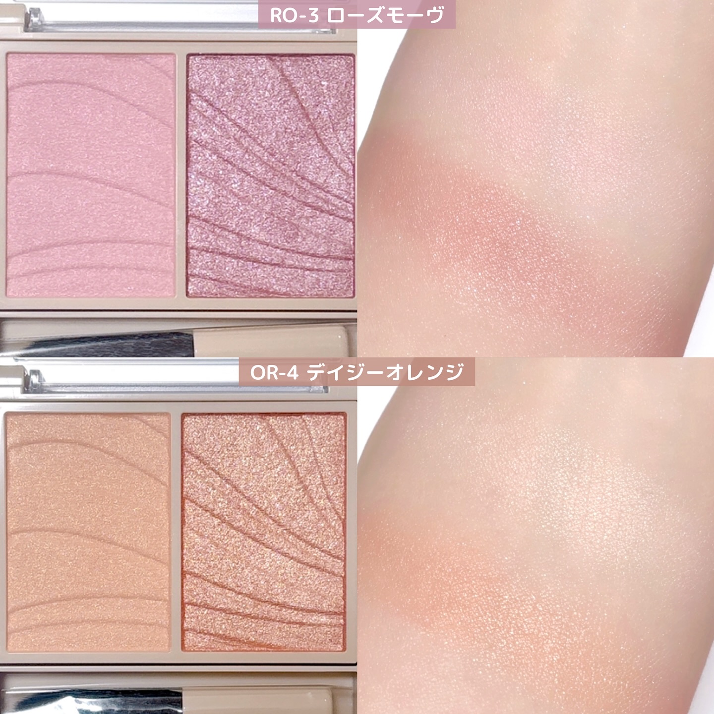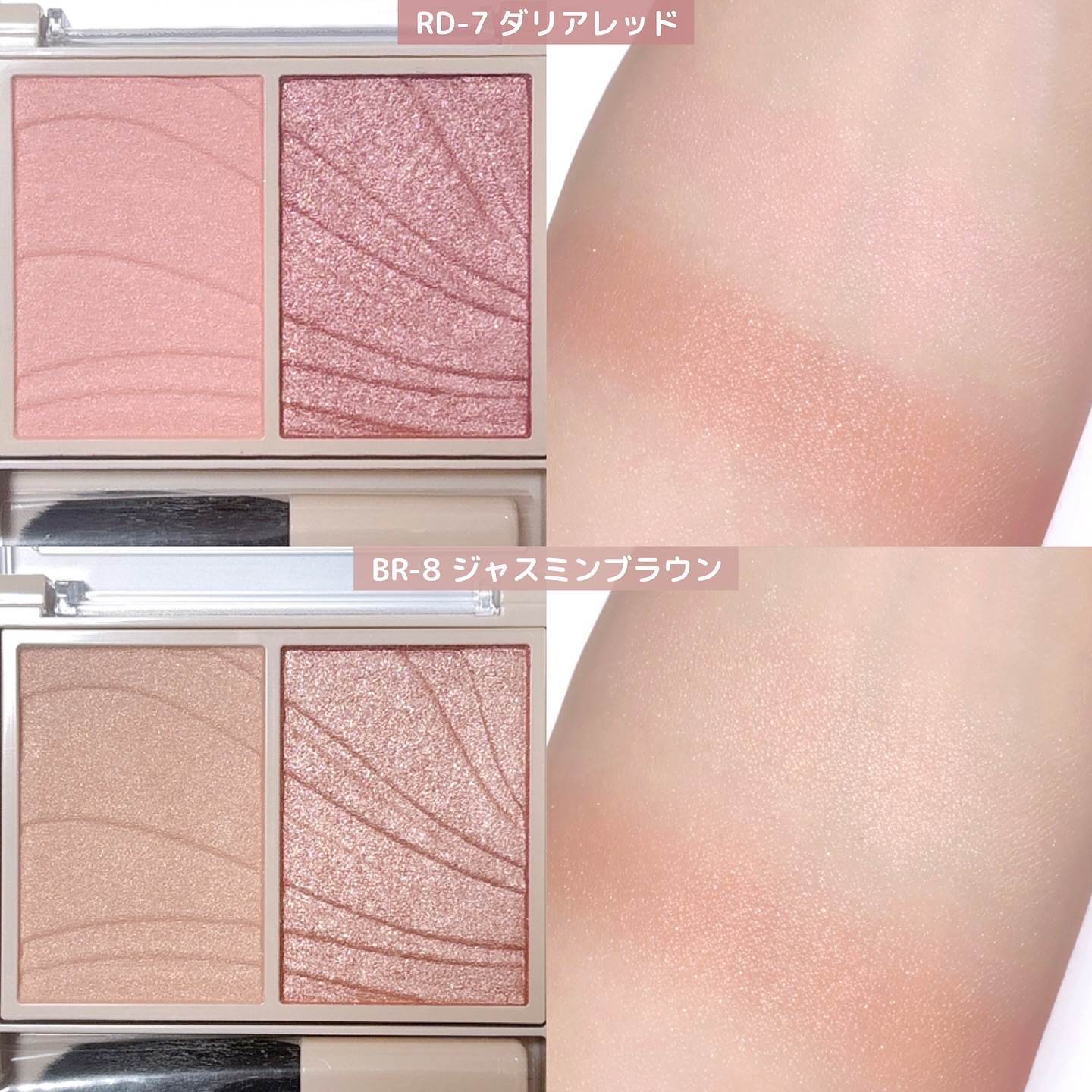 - ベースで頬を整えて色を重ね、花びらのような血色感×立体ツヤを生み出す。 マットベースとパールカラーの 2質感チークカラー。