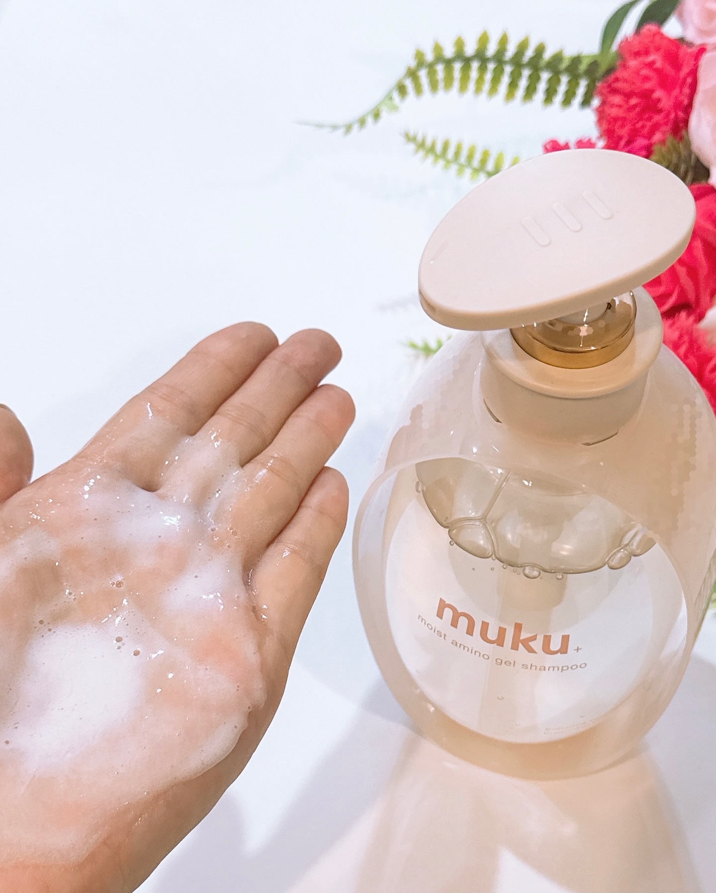 ムク+ モイストアミノジェルシャンプームク+ モイストアミノジェルトリートメントを使用しました😊髪のパサつきが気になる私のような方に向けたシャンプートリートメントになっております✨シャンプーはジェル状のテクスチャーで手のひらで白くなるまで5秒...