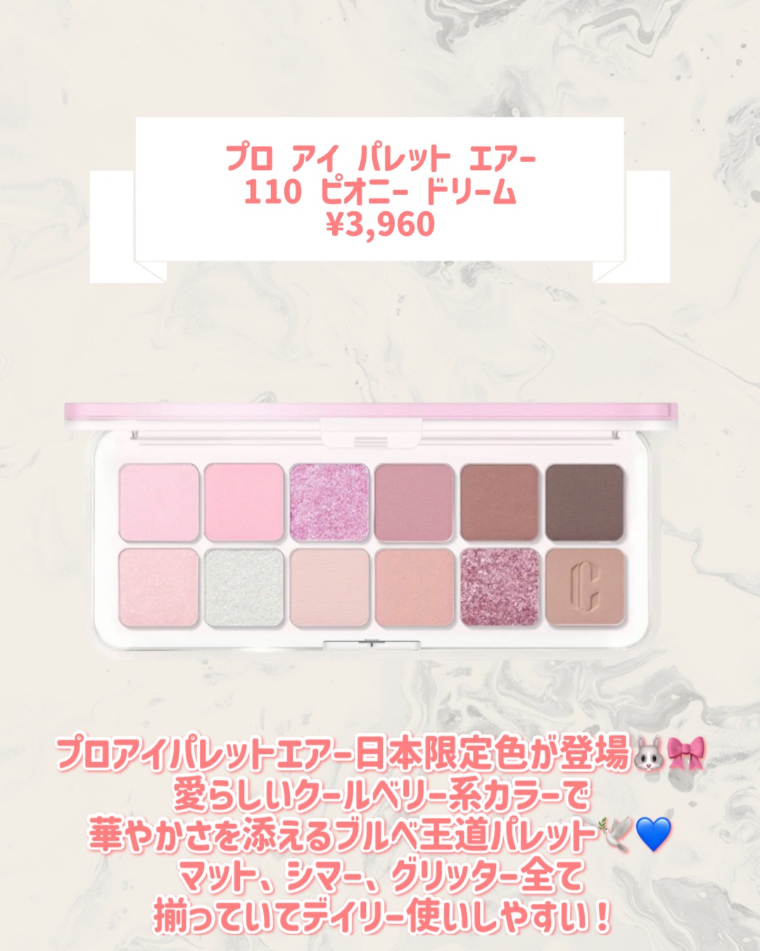 CLIOの大人気アイシャドウパレット“プロアイパレットエアー”から日本限定の新色が登場🎨💞⚜️CLIOプロアイパレットエアー110ピオニードリーム110ピオニードリームは明るめピンクとブルベの方でも使いやすい黄みのない深みブラウンカラーが入っ...