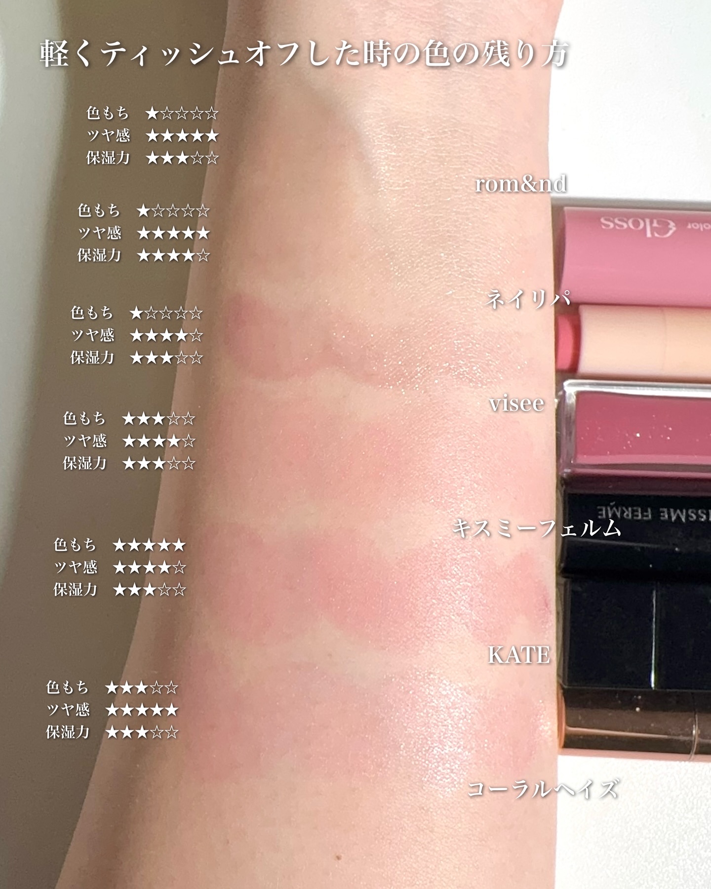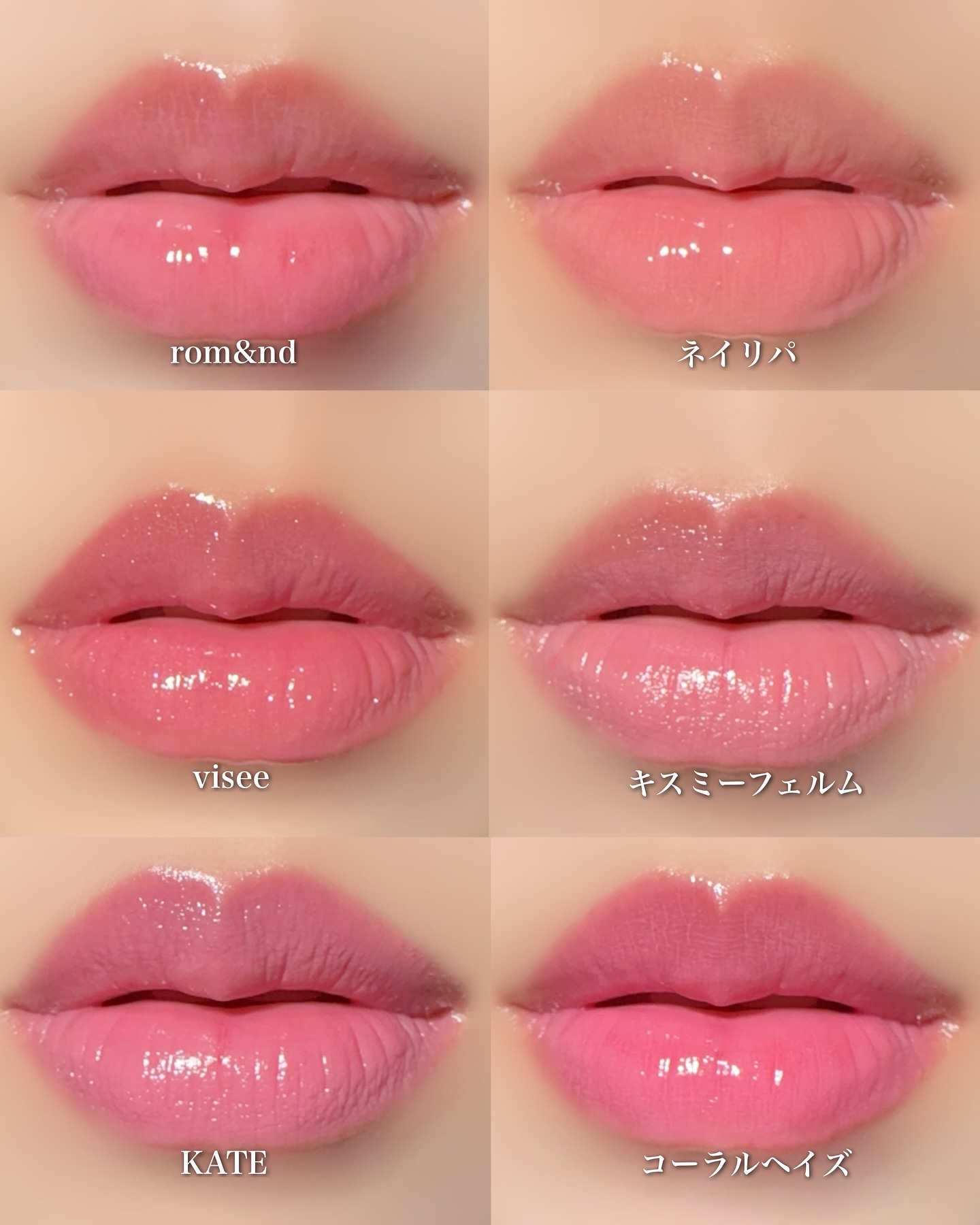 ねっちょりボリューム感あるテクスチャーだけど、ベタつきなく使いやすい。 ティントじゃない普通のグロスだから色もちは良くない。 発色ナチュラルだからこれだけでもいいけど、他のリップと合わせても可愛い!!