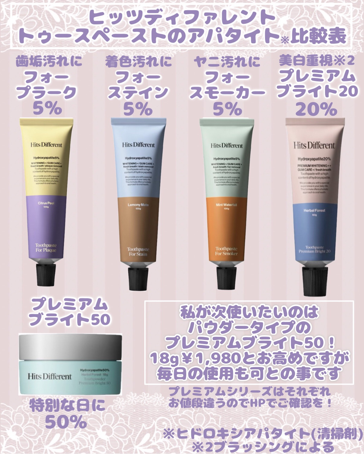 Hits Different ヒッツディファレント トゥースパウダー プレミアム ブライト 50 | 1,980円 |