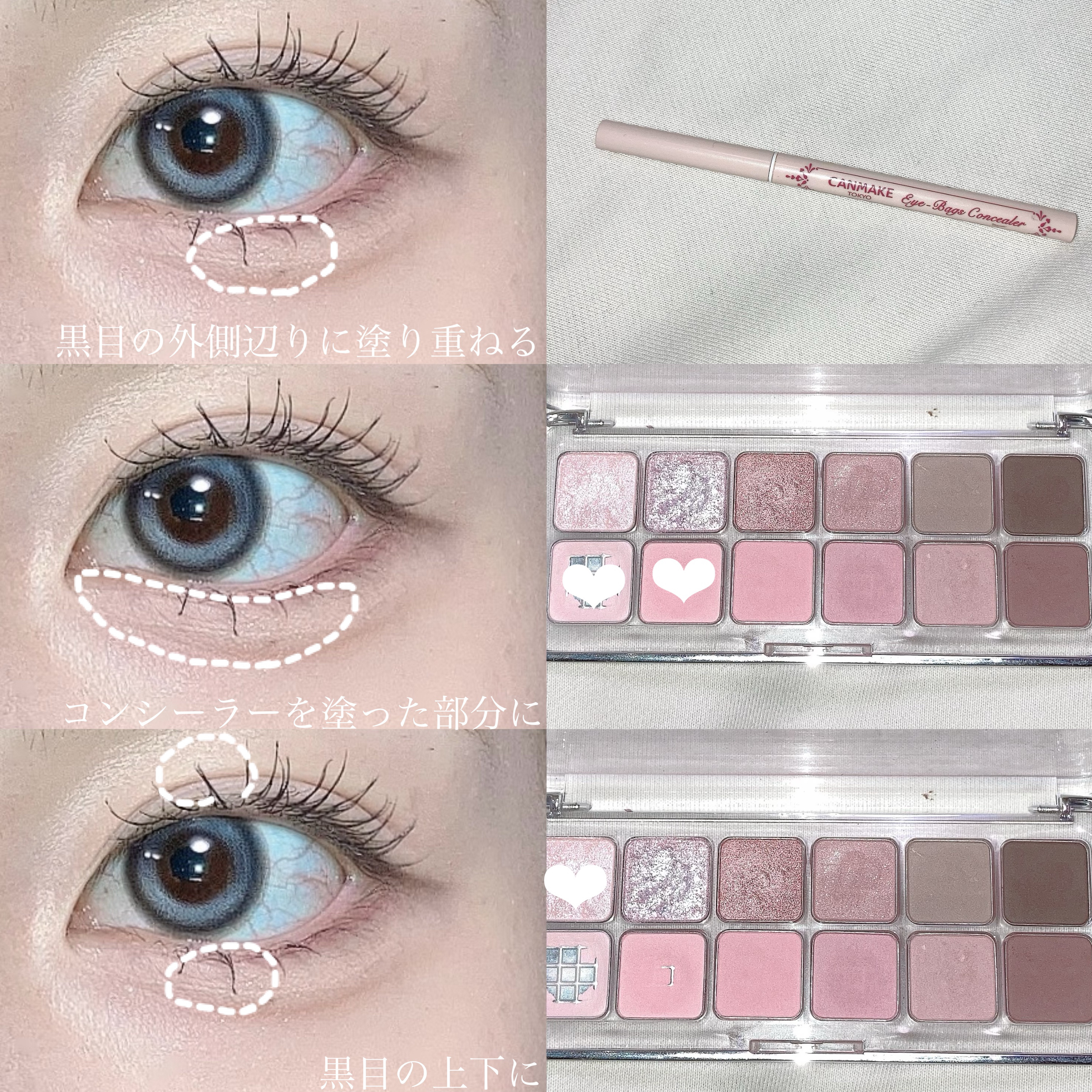 アイシャドウ👀・CLIOプロ アイ パレット01SIMPLY PINK グリッター✨・PERIPERAデュオ ポケット グリッター シャドウ03SALTED SUGARPLUM 涙袋のコンシーラー👧・キャンメイクカラーミキシングコンシーラーオレンジベージュ マスカラ💇♀️・rom&ndハンオールフィックスマスカラL02LONG ASH アイライン✏️・キャンメイククリーミータッチライナーダークブラウン・CEZANNE極細アイライナーEX20ブラウン