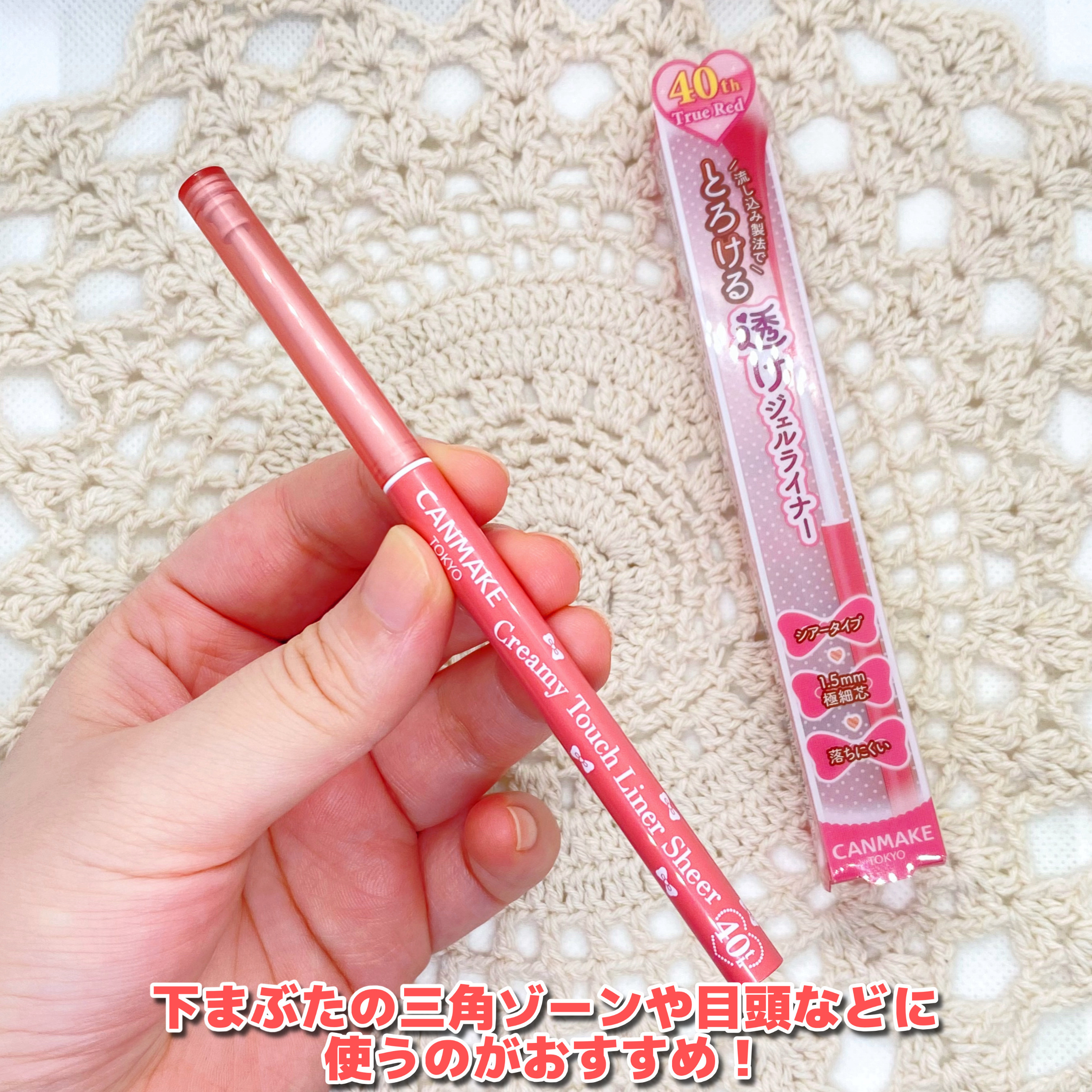 - 1.5㎜のとろける描き心地の極細ジェルライナー「クリーミータッチライナー」から、シアータイプが登場! 肌に溶け込むような透け発色で、メイク感を抑えた自然な仕上がり。 シアーなのにとにかく落ちにくい! 水・涙・汗に強いウォータープルーフで こすれにも強く、きれいな仕上がりが長時間続きます。 肌あたりが優しいやわらかな芯で、ラインを引く際にまぶたへの引っ掛かりも少なく肌をすべるようにスルスルとアイラインが引けます✨ 40th トゥルーレッドのキャップは、40周年記念として初回発売時のみ限定デザインで登場💗(※数量限定) ※初回限定キャップがなくなり次第通常キャップに切替となります。 【注意】 ★大変柔らかい芯ですので、芯は1㎜程度繰り出してお使いください。 ★一度繰り出した芯は戻りませんのでご注意ください。 ★芯が乾かないように、必ずキャップを閉めて保管してください。