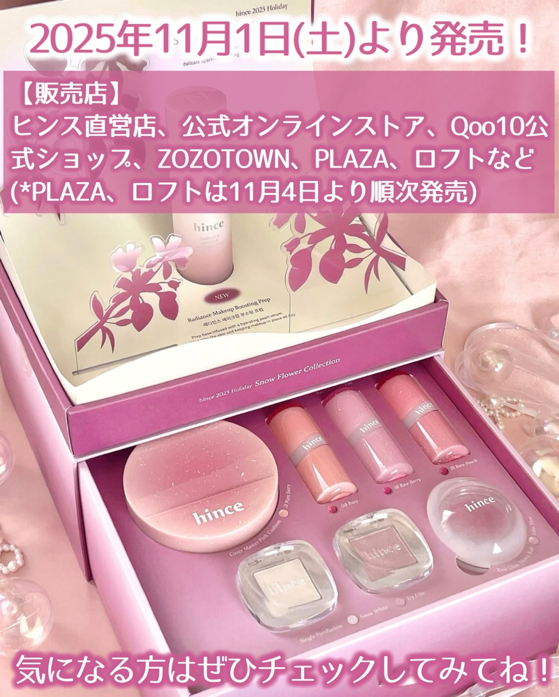 \hinceホリデー限定スノーフラワーコレクション🩷/ヒンスからホリデー限定✨スノーフラワーコレクションが新登場❄冬にピッタリな限定パッケージにテンション上がるよ🥺🤍🤍そして、新作のラディアンスメイクアップブースティングプレップも登場!!しっ...