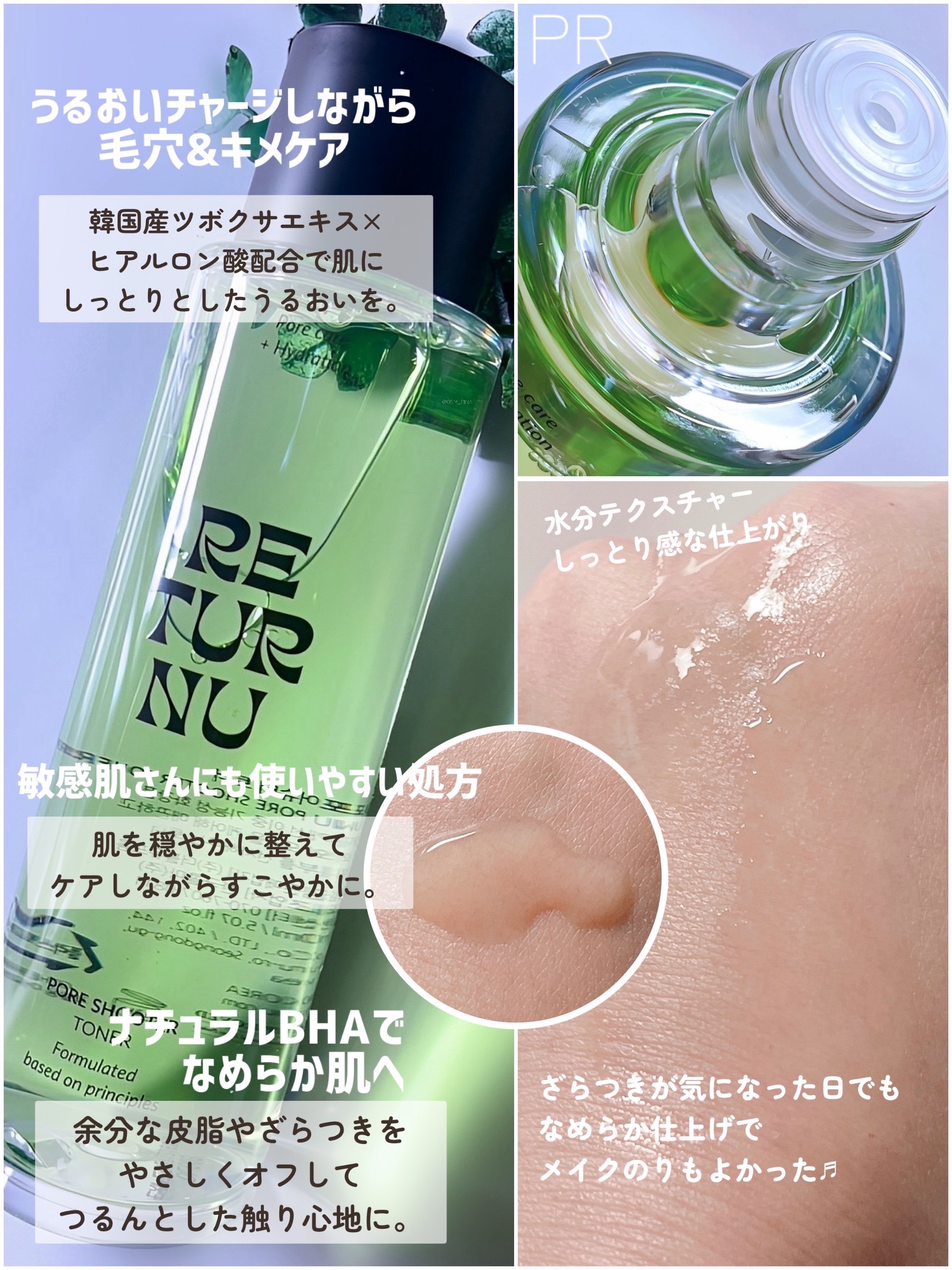 𓈒𓏸︎︎︎︎#PRリターニュのポアシュータートナー韓国産カキ葉エキスとヒアルロン酸配合で保湿しながら毛穴ケアやキメが整う効果が期待できるトナー🫧さらにナチュラルBHA成分でつるんとなめらかな肌に導いてくれます✨️敏感肌にも使える低刺激処方でど...