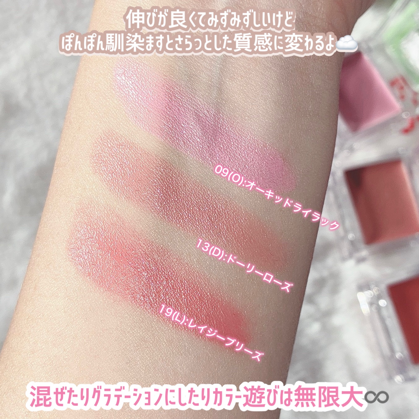 - <01 Q クイーンズコーラル> イソノナン酸イソノニル、シリカ、イソノナン酸イソトリデシル、トリイソステアリン酸ポリグリセリル-2、合成ワックス、マイカ、ヒマワリ種子ロウ、トリ(カプリル酸/カプリン酸)グリセリル、ポリヒドロキシステアリン酸、PEG-10ジメチコン、メチコン、カプリル酸グリセリル、エチルヘキシルグリセリン、(エチレン/プロピレン)コポリマー、水酸化Al、リンゴ酸ジイソステアリル、酸化チタン、酸化鉄、赤202 <02 W ウィップペタル> イソノナン酸イソノニル、シリカ、イソノナン酸イソトリデシル、合成ワックス、トリイソステアリン酸ポリグリセリル-2、マイカ、ヒマワリ種子ロウ、トリ(カプリル酸/カプリン酸)グリセリル、ポリヒドロキシステアリン酸、PEG-10ジメチコン、メチコン、カプリル酸グリセリル、水酸化Al、エチルヘキシルグリセリン、(エチレン/プロピレン)コポリマー、酸化チタン、黄5、赤104(1)、赤202 <05 T サンクストゥユー> イソノナン酸イソノニル、シリカ、イソノナン酸イソトリデシル、合成ワックス、トリイソステアリン酸ポリグリセリル-2、マイカ、ヒマワリ種子ロウ、トリ(カプリル酸/カプリン酸)グリセリル、ポリヒドロキシステアリン酸、PEG-10ジメチコン、メチコン、カプリル酸グリセリル、エチルヘキシルグリセリン、水酸化Al、(エチレン/プロピレン)コポリマー、酸化チタン、酸化鉄、赤202 <06 Y ワイツーケー キス> イソノナン酸イソノニル、シリカ、イソノナン酸イソトリデシル、トリイソステアリン酸ポリグリセリル-2、合成ワックス、マイカ、ヒマワリ種子ロウ、トリ(カプリル酸/カプリン酸)グリセリル、ポリヒドロキシステアリン酸、PEG-10ジメチコン、メチコン、カプリル酸グリセリル、エチルヘキシルグリセリン、水酸化Al、(エチレン/プロピレン)コポリマー、酸化チタン、赤202、黄5、黄4 <08 I イントゥ ピンク> イソノナン酸イソノニル、シリカ、イソノナン酸イソトリデシル、トリイソステアリン酸ポリグリセリル-2、合成ワックス、マイカ、ヒマワリ種子ロウ、トリ(カプリル酸/カプリン酸)グリセリル、ポリヒドロキシステアリン酸、PEG-10ジメチコン、メチコン、カプリル酸グリセリル、エチルヘキシルグリセリン、水酸化Al、(エチレン/プロピレン)コポリマー、酸化チタン、黄5、赤202、赤104(1) <09 O オーキッド ライラック> イソノナン酸イソノニル、シリカ、イソノナン酸イソトリデシル、トリイソステアリン酸ポリグリセリル-2、合成ワックス、マイカ、ヒマワリ種子ロウ、トリ(カプリル酸/カプリン酸)グリセリル、ポリヒドロキシステアリン酸、PEG-10ジメチコン、メチコン、カプリル酸グリセリル、エチルヘキシルグリセリン、水酸化Al、(エチレン/プロピレン)コポリマー、酸化チタン、赤202、赤104(1)、黄4、青1 <12 S シュガー ベール> イソノナン酸イソノニル、シリカ、イソノナン酸イソトリデシル、トリイソステアリン酸ポリグリセリル-2、合成ワックス、マイカ、ヒマワリ種子ロウ、トリ(カプリル酸/カプリン酸)グリセリル、ポリヒドロキシステアリン酸、PEG-10ジメチコン、メチコン、カプリル酸グリセリル、エチルヘキシルグリセリン、水酸化Al、(エチレン/プロピレン)コポリマー、リンゴ酸ジイソステアリル、酸化チタン、酸化鉄、赤202 <13 D ドーリー ローズ> イソノナン酸イソノニル、シリカ、イソノナン酸イソトリデシル、トリイソステアリン酸ポリグリセリル-2、合成ワックス、マイカ、ヒマワリ種子ロウ、トリ(カプリル酸/カプリン酸)グリセリル、ポリヒドロキシステアリン酸、PEG-10ジメチコン、メチコン、カプリル酸グリセリル、エチルヘキシルグリセリン、水酸化Al、リンゴ酸ジイソステアリル、(エチレン/プロピレン)コポリマー、酸化チタン、酸化鉄、赤202、赤104(1) <14 F フォール イン モーブ> イソノナン酸イソノニル、シリカ、イソノナン酸イソトリデシル、トリイソステアリン酸ポリグリセリル-2、合成ワックス、マイカ、ヒマワリ種子ロウ、トリ(カプリル酸/カプリン酸)グリセリル、ポリヒドロキシステアリン酸、PEG-10ジメチコン、メチコン、カプリル酸グリセリル、リンゴ酸ジイソステアリル、エチルヘキシルグリセリン、水酸化Al、(エチレン/プロピレン)コポリマー、酸化チタン、酸化鉄、赤202 <19 L レイジー ブリーズ> イソノナン酸イソノニル、シリカ、イソノナン酸イソトリデシル、トリイソステアリン酸ポリグリセリル-2、合成ワックス、マイカ、ヒマワリ種子ロウ、トリ(カプリル酸/カプリン酸)グリセリル、ポリヒドロキシステアリン酸、PEG-10ジメチコン、メチコン、カプリル酸グリセリル、エチルヘキシルグリセリン、(エチレン/プロピレン)コポリマー、水酸化Al、リンゴ酸ジイソステアリル、酸化チタン、酸化鉄、赤202 <21 X シア ローズ> イソノナン酸イソノニル、シリカ、イソノナン酸イソトリデシル、トリイソステアリン酸ポリグリセリル-2、合成ワックス、マイカ、ヒマワリ種子ロウ、トリ(カプリル酸/カプリン酸)グリセリ