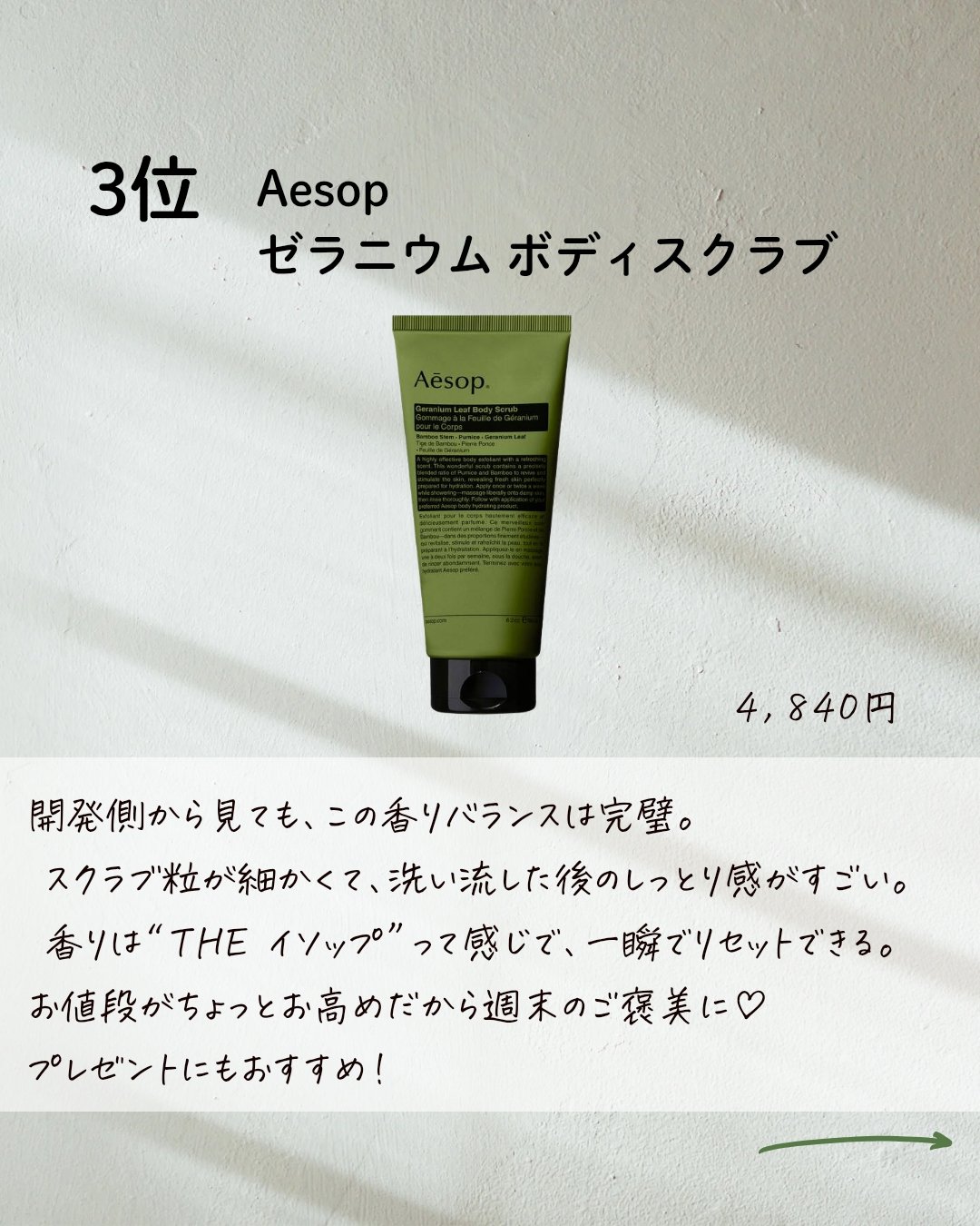 Aesop ゼラニウム ボディスクラブ | 4,840円 |