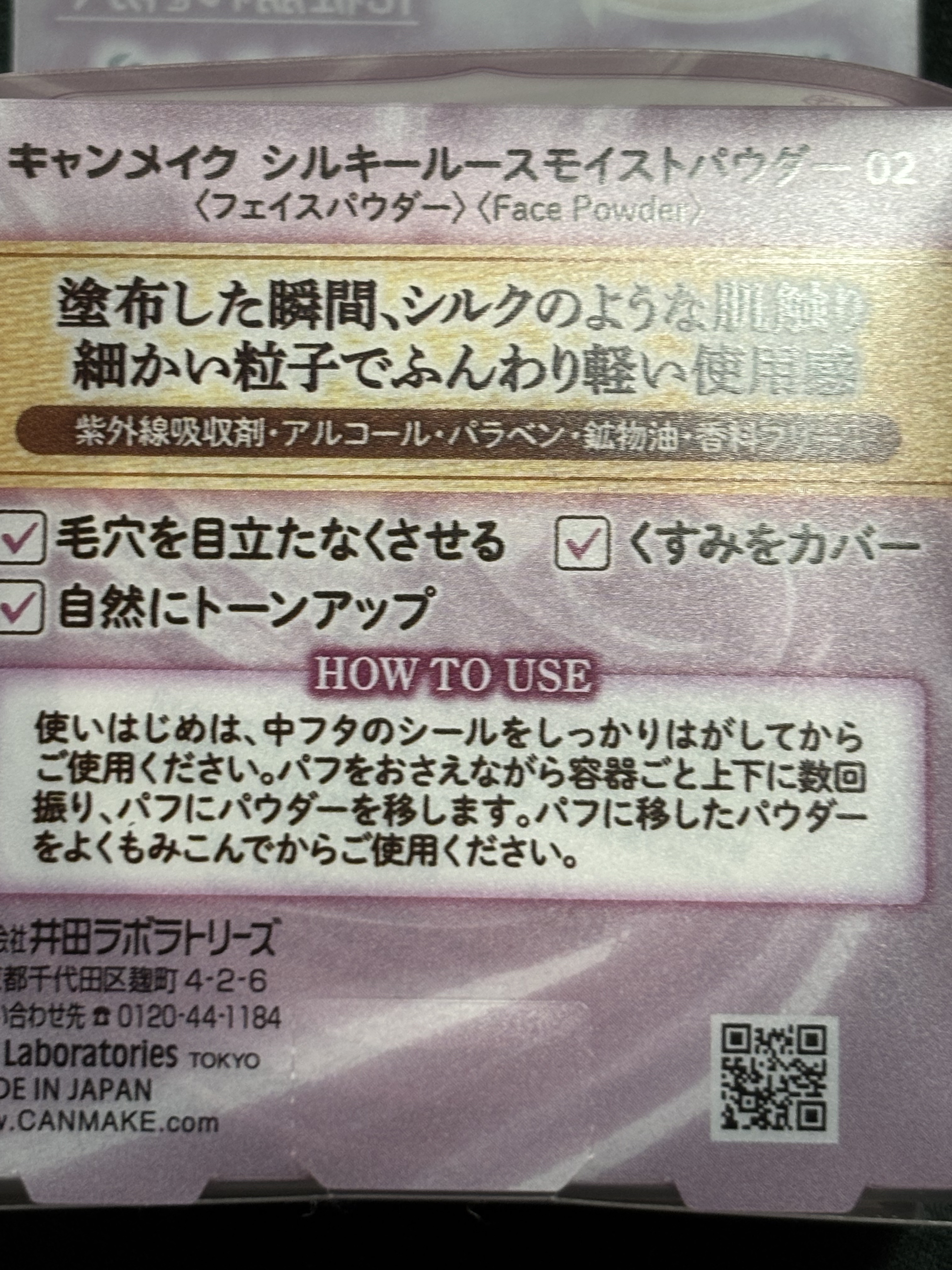 - <01 シルキーベージュ> タルク、(ビニルジメチコン/メチコンシルセスキオキサン)クロスポリマー、酸化チタン、ラウリン酸亜鉛、酸化亜鉛、ジメチコン、トリエチルヘキサノイン、ラウロイルリシン、ビサボロール、水酸化Al、ハイドロゲンジメチコン、水、BG、シリカ、グリチルレチン酸ステアリル、セラミドNP、ナツメ果実エキス、ヒアルロン酸Na、ユキノシタエキス、ソメイヨシノ葉エキス、ノイバラ果実エキス、オリーブ葉エキス、マグワ根皮エキス、ゴレンシ葉エキス、ダマスクバラ花エキス、ツボクサ葉/茎エキス、ヒメフウロエキス、メリッサ葉エキス、オウゴン根エキス、ボタンエキス、アセチルヒアルロン酸Na、カンゾウ葉エキス、ハイビスカス花エキス、クズ根エキス、ゲットウ葉エキス、ハトムギ種子エキス、ビルベリー葉エキス、アロエベラ葉エキス、クロレラエキス、ポリクオタニウム-61、アーチチョーク葉エキス、マイカ、酸化鉄 <02 シアーラベンダー> タルク、(ビニルジメチコン/メチコンシルセスキオキサン)クロスポリマー、酸化チタン、ラウリン酸亜鉛、酸化亜鉛、ジメチコン、トリエチルヘキサノイン、ラウロイルリシン、ビサボロール、水酸化Al、ハイドロゲンジメチコン、水、BG、シリカ、グリチルレチン酸ステアリル、セラミドNP、ナツメ果実エキス、ヒアルロン酸Na、ユキノシタエキス、ソメイヨシノ葉エキス、ノイバラ果実エキス、オリーブ葉エキス、マグワ根皮エキス、ゴレンシ葉エキス、ダマスクバラ花エキス、ツボクサ葉/茎エキス、ヒメフウロエキス、メリッサ葉エキス、オウゴン根エキス、ボタンエキス、アセチルヒアルロン酸Na、カンゾウ葉エキス、ハイビスカス花エキス、クズ根エキス、ゲットウ葉エキス、ハトムギ種子エキス、ビルベリー葉エキス、アロエベラ葉エキス、クロレラエキス、ポリクオタニウム-61、アーチチョーク葉エキス、マイカ、青1、赤226、グンジョウ、酸化鉄 <P01 ラスターピンク> タルク、酸化チタン、(ビニルジメチコン/メチコンシルセスキオキサン)クロスポリマー、ラウリン酸亜鉛、酸化亜鉛、ジメチコン、トリエチルヘキサノイン、ラウロイルリシン、ビサボロール、水酸化Al、ハイドロゲンジメチコン、水、BG、シリカ、グリチルレチン酸ステアリル、セラミドNP、ナツメ果実エキス、ヒアルロン酸Na、ユキノシタエキス、ソメイヨシノ葉エキス、ノイバラ果実エキス、オリーブ葉エキス、マグワ根皮エキス、ゴレンシ葉エキス、ダマスクバラ花エキス、ツボクサ葉/茎エキス、ヒメフウロエキス、メリッサ葉エキス、オウゴン根エキス、ボタンエキス、アセチルヒアルロン酸Na、カンゾウ葉エキス、ハイビスカス花エキス、クズ根エキス、ゲットウ葉エキス、ハトムギ種子エキス、ビルベリー葉エキス、アロエベラ葉エキス、クロレラエキス、ポリクオタニウム-61、アーチチョーク葉エキス、マイカ、ホウケイ酸(Ca/Al)、酸化鉄