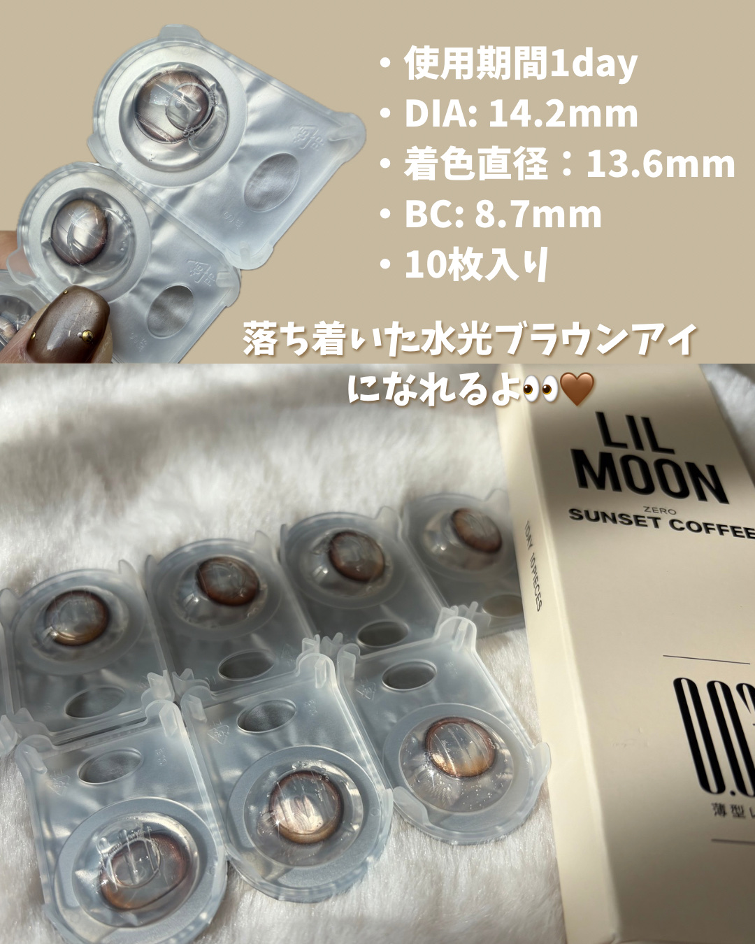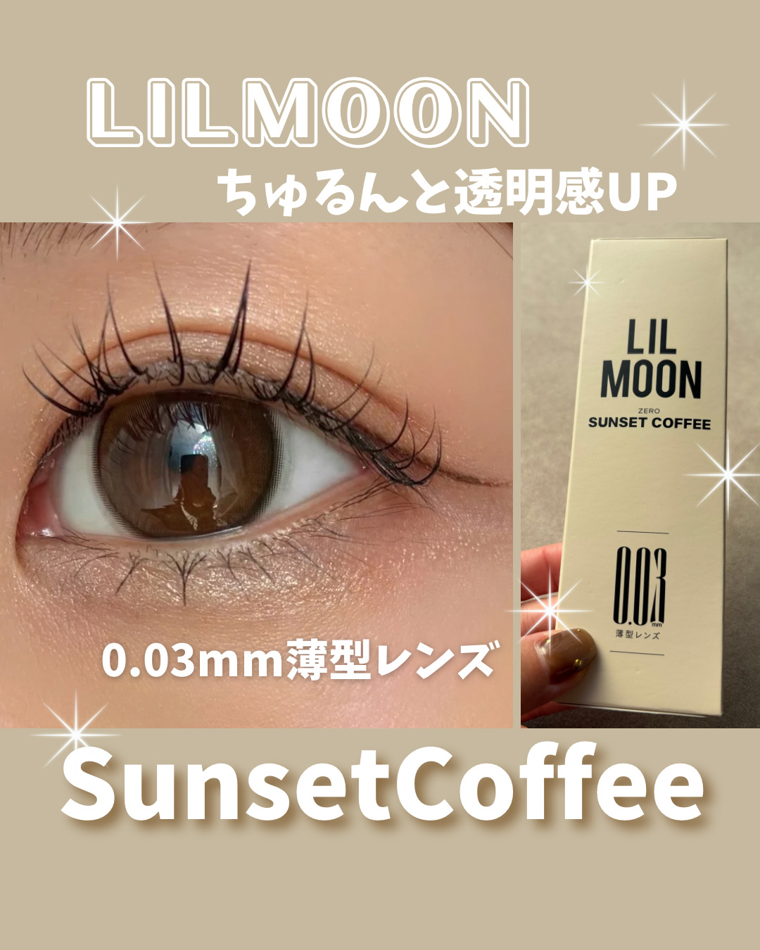 - "ZERO”感つけ心地、きらめきUP! (1)全度数0.03mm極薄*1*2 LILMOON(リルムーン)「0.03シリーズ」は、全度数レンズの中心厚が0.03㎜で、レンズが薄く厚みが少ない分、まるで裸眼のような快適な付け心地で異物感を感じにくいです。 (2) 全度数酸素透過率DK/t:45 『LIL MOON(リルムーン)』0.03シリーズは全度数レンズの酸素透過率DK/t:45、従来の含水率38%通常厚レンズと比べ2倍以上*2の酸素透過率を実現し、酸素不足による充血を軽減。高い保水力を持つMPCポリマーを保存液に配合し、乾燥や目のゴロゴロ感を軽減。 (3)気分で選べるクリアレンズとカラーレンズ 多彩な瞳も、自然な瞳も,カラコンとクリアレンズ、どちらも揃う。カラコンお試しサイズ2枚入りを用意、気軽にお試しできちゃう。幅広いラインナップで、瞳に自信と輝きをプラス、毎日のスタイルを自由に楽しめる! <クラッシュグレー> センス◎!やりすぎないアクセントで、馴染みのいいアッシュグレーアイ <サンセットコーヒー> ちゅるんと透明感UP演出! 落ち着いた水光ブラウンアイ <ジェントルピンク> クリっと瞳を際立たせるふんわり太フチと、 優しいほんのりピンクアイ <ゼロインク> ダークウッドをイメージしたブラックレンズ、透明感あふれるクリっとした瞳 <ゼロヘーゼル> 大人っぽいブラウンに差し込む ヘーゼルカラー、オシャレなブラウンアイ <ゼロチャコール> 落ち着いたダークグレーにブルー でアクセント、クールな大人アイ <レイクブルー> ほどよいフチ感で立体感見え重視、深みのあるダークブルーアイ *1:使用感には個人差があります *2:当社製品比較 カラーコンタクトレンズの不適正使用による眼障害の危険性等などがあります。 ●コンタクトレンズは高度管理医療機器です。不十分な洗浄・消毒など不適切なケアや、長時間・交換期間を超えた装用により、アレルギー性結膜炎、角膜感染症、角膜潰瘍等の重篤な眼障害が発生する危険性があります ●ご使用前に取扱説明書を確認してください 使用上の留意事項 ●眼科医院等を受診してからお求めください ●眼に異常を感じたら直ちにレンズ使用を中止し、お近くの眼科等で診察を受けてください ●医師の指示にしたがってご使用ください ●コンタクトレンズを装用する場合、自覚症状がなくても、眼科医院等での定期検査を受けてください ●レンズに不具合がある場合は使用しないでください