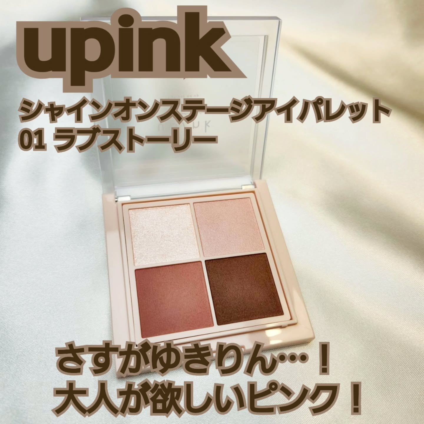 ゆきりんこと柏木 由紀さんがプロデュースするupinkにホリデー限定のシャインオンステージアイパレットが先日登場! この冬にピッタリ、冬空に煌めくホリデーカラーの4色でグリッター、マット、シマー…と異なる質感です。 しっとりとした粉質でピタッと瞼に密着し、簡単にナチュラルなグラデーションが完成します。