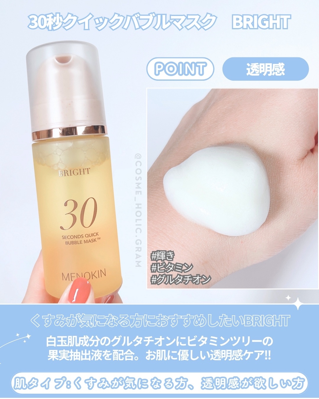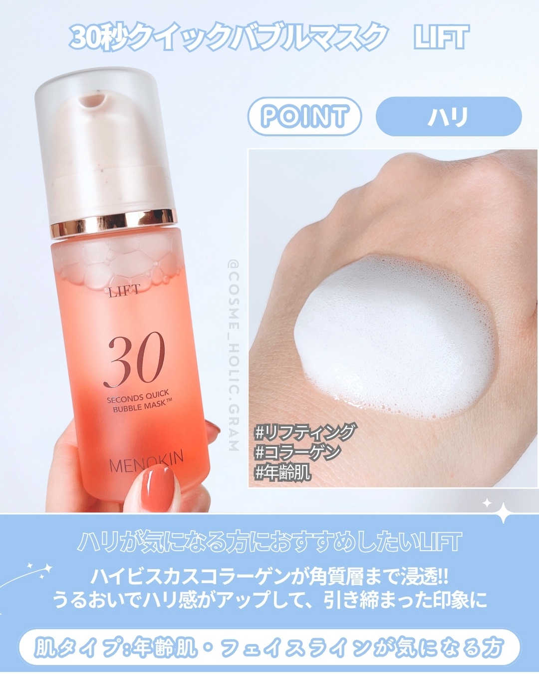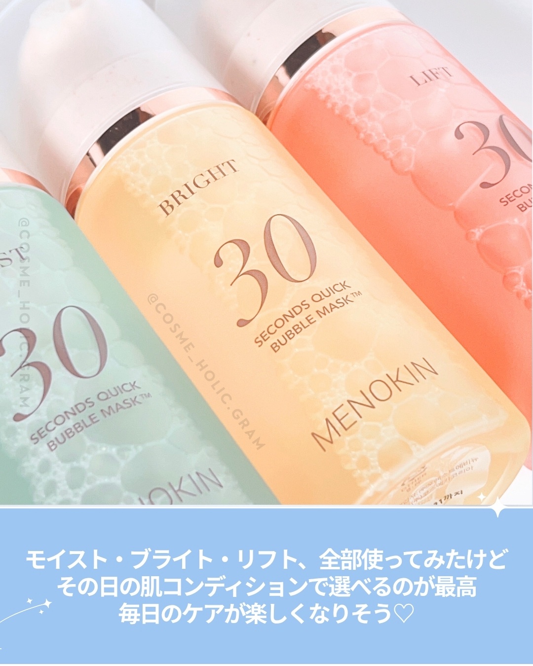 ・・MENOKIN@menokin_jpクイックバブルマスクリフト・忙しい朝に、疲れた夜に、シートマスクでケアする5分を30秒に短縮できちゃうバブルマスク🫧自身の肌悩みに合わせて5種類から選べて、重ねることも可能🙆🏻♀️組み合わせ次第では、...