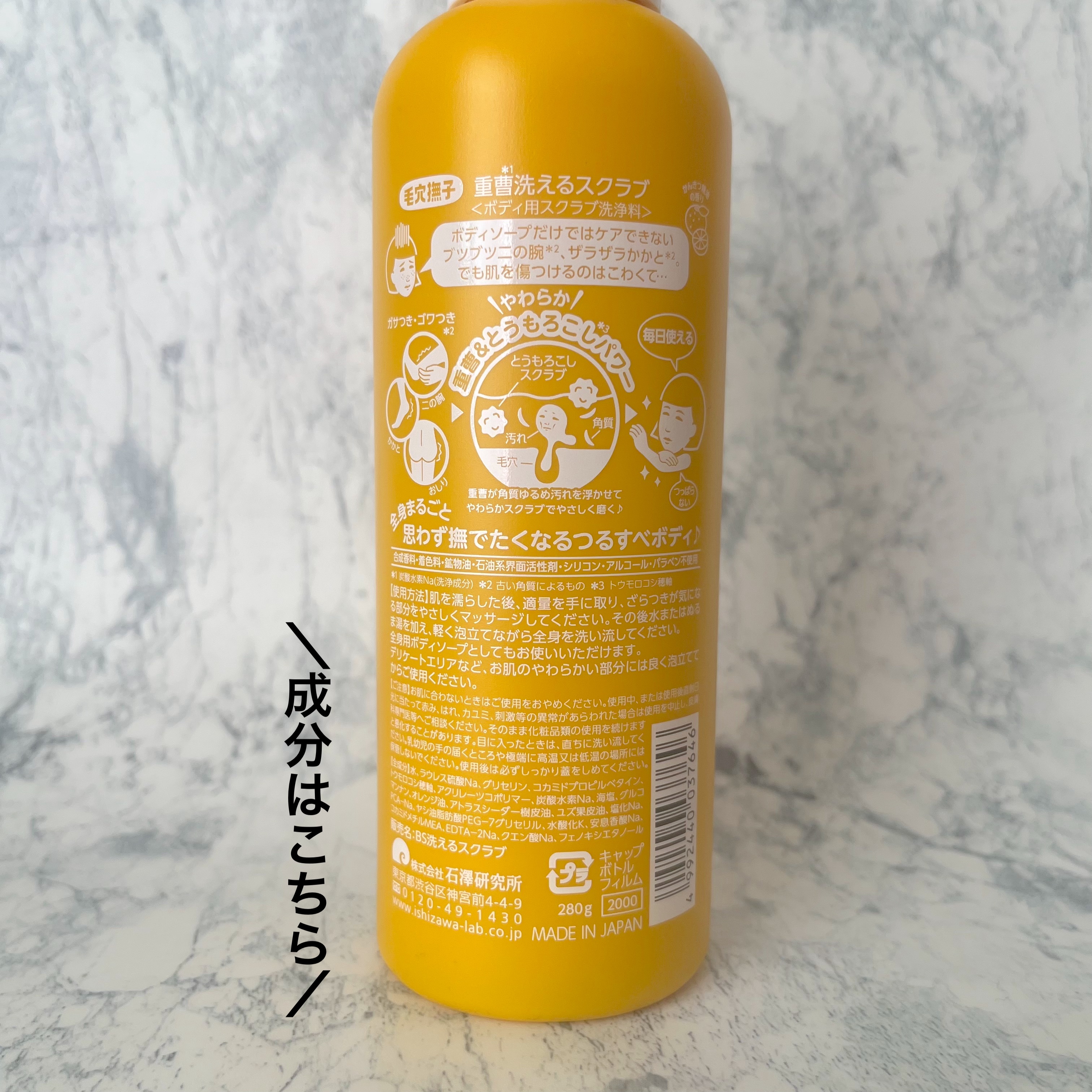 - ブツブツ二の腕にザラザラかかと・・・気になる全身のガサつき・ゴワつき*1は重曹*2&とうもろこし*3の洗えるスクラブで丸ごとつるんっ♪ 重曹が角質をゆるめ汚れを浮かせ、とうもろこしのやわらかスクラブでやさしい使い心地で磨きます。 思わず撫でたくなるようなつるすべボディに。 しっかり泡立てるとボディソープにもなる1本2役。毎日使えます。 かんきつ精油の香り。 *1 古い角質によるもの *2 炭酸水素Na(洗浄成分) *3 トウモロコシ穂軸