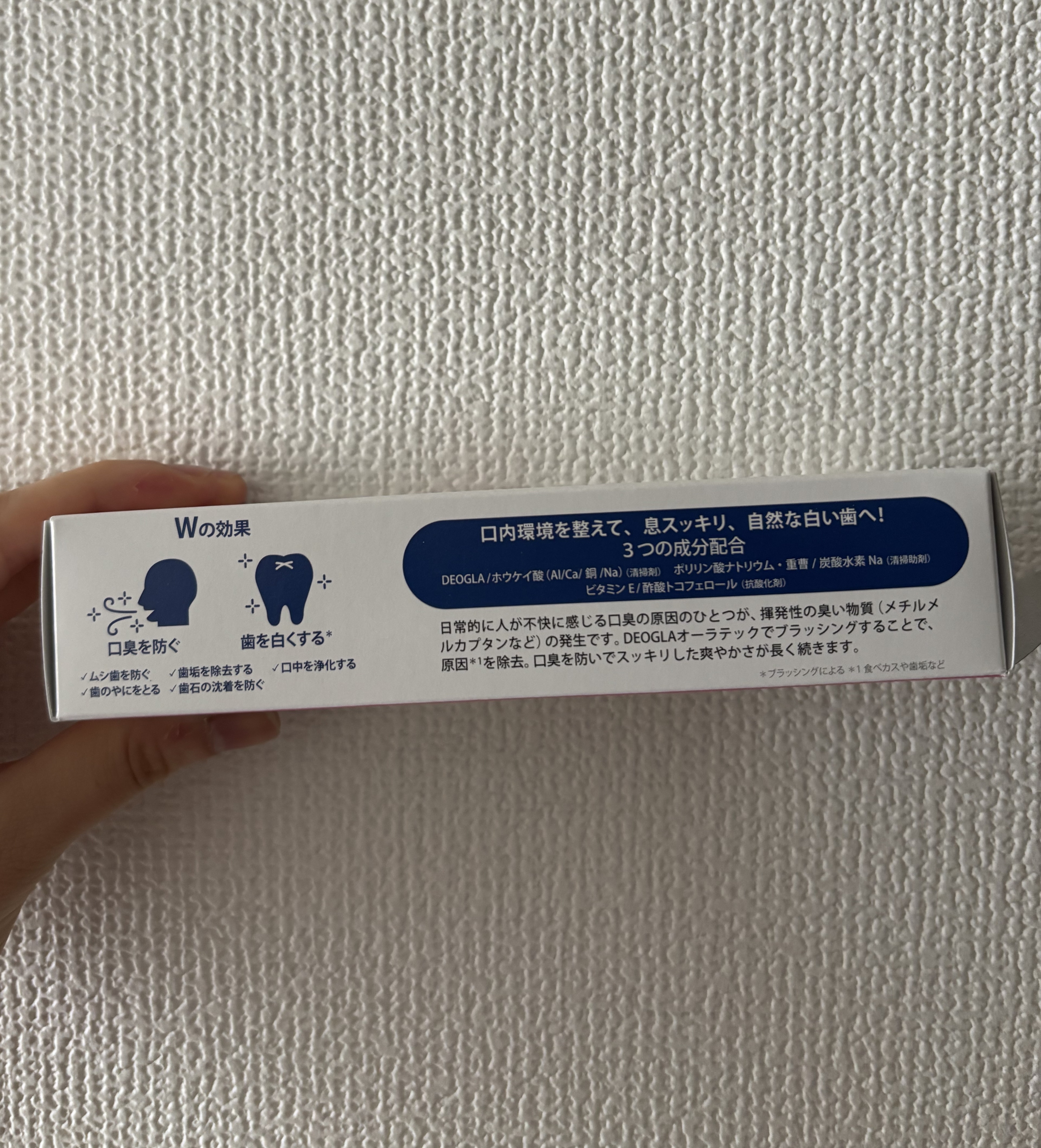 - \独自成分「DEOGLA®︎」(清掃剤)配合/ 創業200年を超える素材メーカーがつくる口臭ケアに特化した歯磨き粉! 製品の特長: 多数のご要望をいただいていた、口臭とホワイトニング *を1本でケアいただけます。ホワイトニング *はもちろん、独自成分DEOGLA配合で口臭にアプローチ。 徹底的にこだわった成分を配合しているので、口臭ケアとしてだけでなくお口のトータルケアにご活用ください。 ミントが苦手な方にもおすすめな、レモングラス香味、控え目な泡立ちでしっかりとブラッシングしていただけます。 ▶独自成分DEOGLA : 化粧品成分名称 ホウケイ酸(Al/Ca/銅/Na) *ブラッシングによる