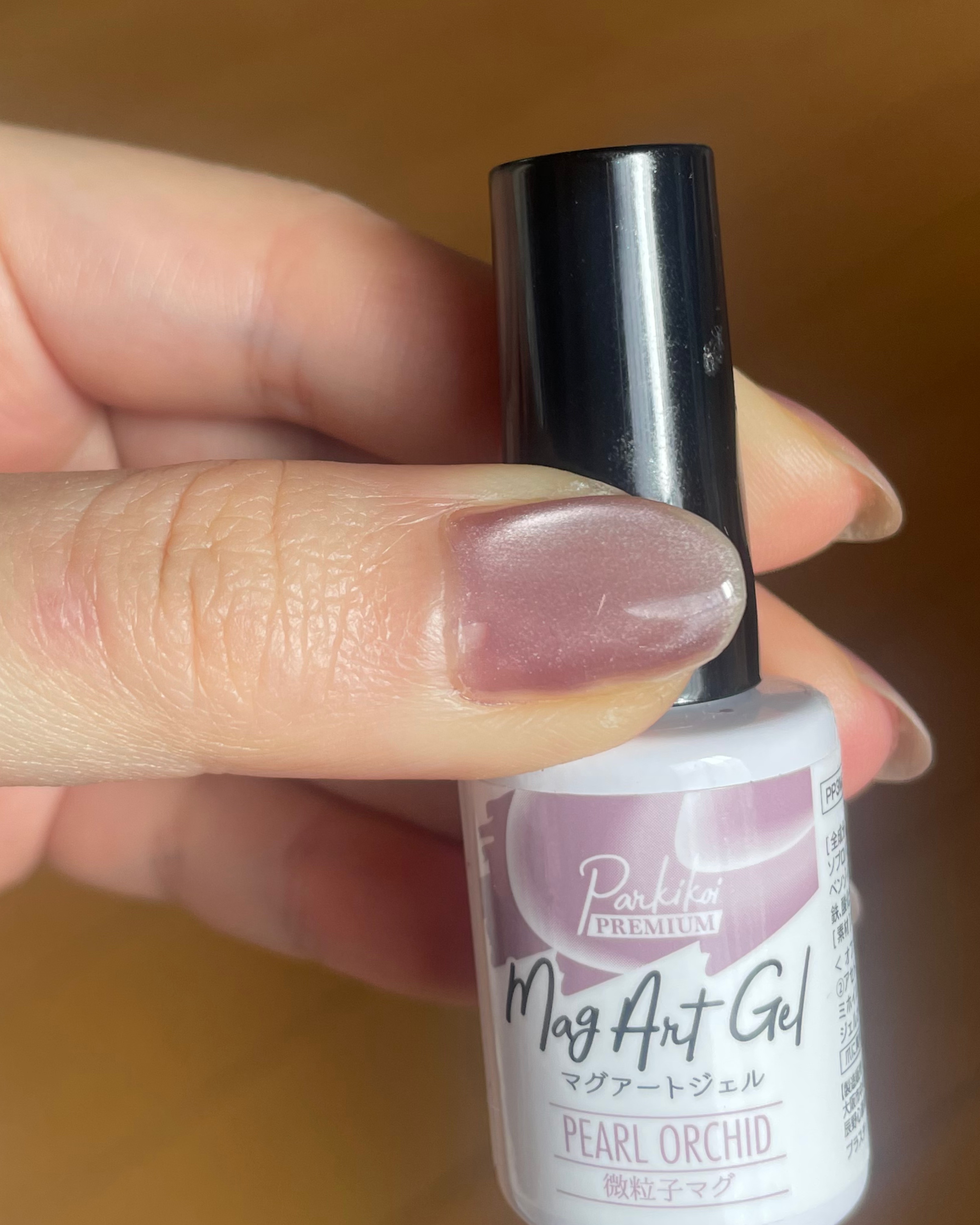 CanDoマグアートジェル使用色:GALAXYPINK濃いめのピンクです紫にブラウンが混ざったような感じマグネットジェルで300円商品ですマグネットジェルをする時にいつもカラーのとき2回ともマグネットで同じ位置にマグを集めるようにやってたので...