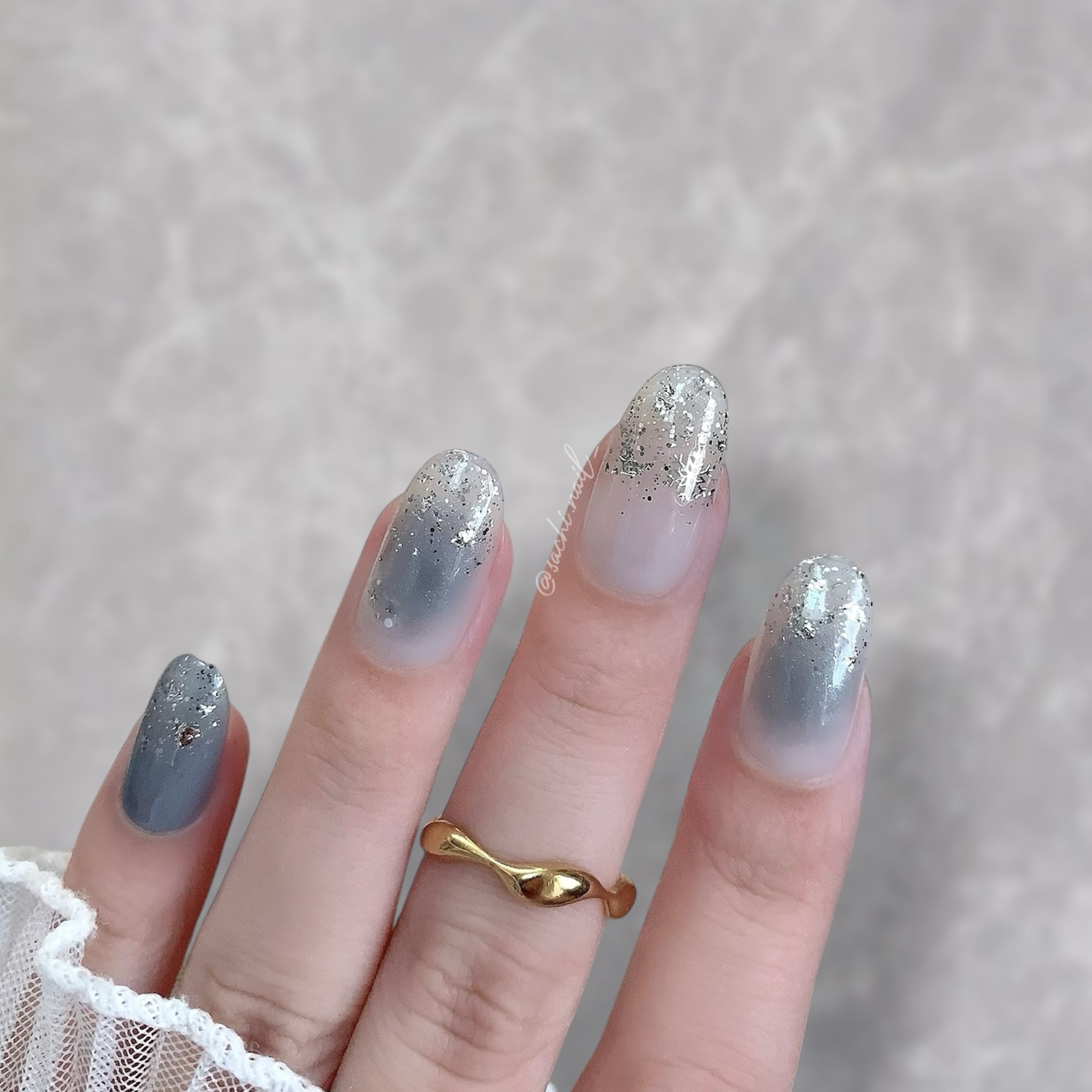 ワンカラーでも指ごとに色を変えるだけでオシャレに見えます💕 画像のようにゴールドラインとストーンを少し足すだけで華やかさがアップ🥰 何度かご紹介したことのあるスポンジで作るグラデーションです✨ スポンジを使うことで境目が綺麗に馴染んでくれます💕 アルミホイルの上でブラウンとトップコートを1:1くらいで混ぜたものを、トップコートのハケに取って3箇所に塗るだけ👌 事前に混ぜたものを塗ることで、爪の上でぼかすより簡単に出来ます💕 ベースカラーが乾く前に点置きしてぼかすことで綺麗にぼかせます✨ スピードが大事なので、使うポリッシュのキャップは全て開けておきましょう😊 天然石のラインはガタガタの方がより天然石っぽく見えるので、ラインを描くのが苦手な方でも大丈夫🙆♀️ 難しそうに見えて、やってみると意外と簡単に出来ます♡