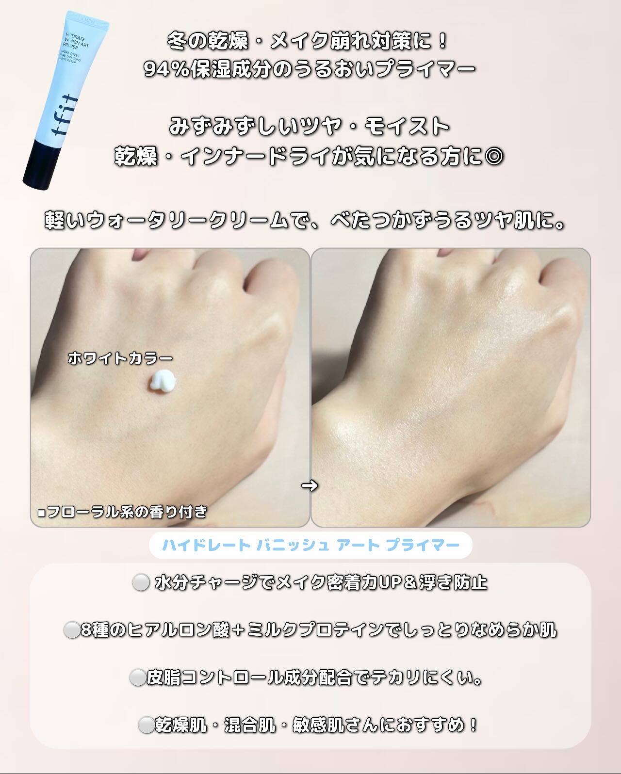 ♡@ame.k.cosme♡♡🤍TFIT@tfit.japan♡♡デリケートシルクヴェールアートプライマーハイドレートバニッシュアートプライマー♡♡✨\秋冬にぴったりのおすすめプライマー/✨乾燥やメイク崩れが気になる季節にベースメイクの密着感...