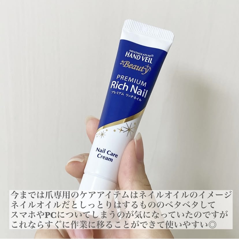 - 「メンソレータム ハンドベール ビューティー プレミアムリッチネイル」は、爪を保護し、すこやかに保つ爪集中補修クリームです。爪が欠けやすい人や爪の乾燥が気になる人、二枚爪の人などにおすすめです。ジェルネイルや研磨によりダメージを受けた爪表面を補修し、除光液や洗剤などにより乾燥した爪周りを保湿。強く美しい健康的な爪へ導きます。