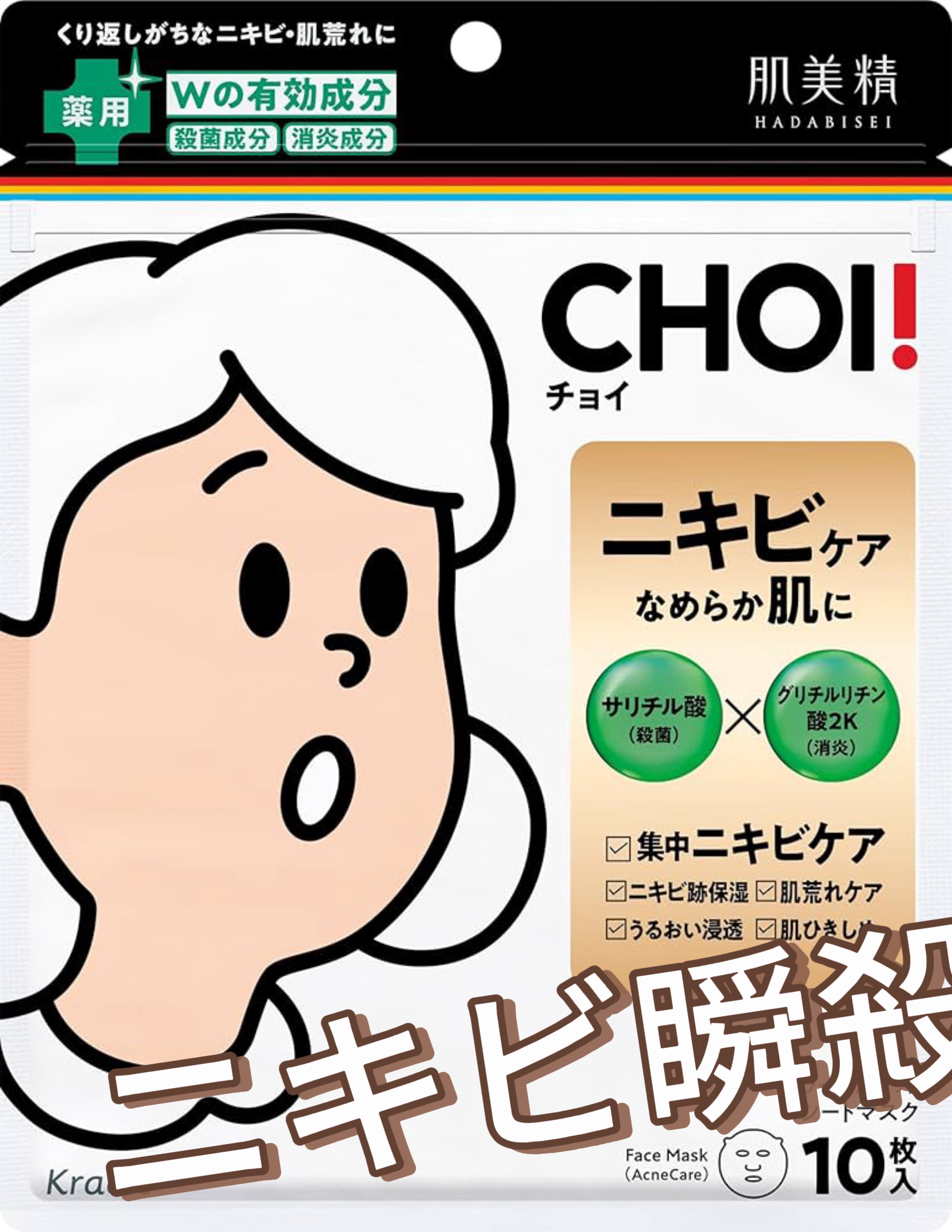 - 【医薬部外品】 ●チョイッと手軽にニキビ悩みを集中ケア!肌美精CHOIシリーズ ニキビケアライン ●くり返しがちなニキビ・肌荒れに。Wの有効成分(殺菌&消炎)配合の薬用処方で、ニキビを予防してニキビの出来にくいなめらか肌へ。 ●5分*1の集中ケアの薬用シートマスク ●殺菌成分「サリチル酸」&消炎成分「グリチルリチン酸2K」配合 ●ひきしめ保湿成分「ビタミンハーブCP*2」&保湿成分「緑茶エキス」配合。肌をキュッとひきしめ、ニキビ跡にもうるおいを補給します。 ●ぴったりフィットシート形状&浸透サポート成分*3配合で、気になるところもしっかり密着してうるおいます。 ●みずみずしい浸透美容液 ●無香料、無着色 ●アレルギーテスト済み*4、ノンコメドジェニックテスト済み*4 *1:お手入れの目安時間 *2:ビタミンC誘導体(硫酸アスコルビル2Na)、カモミール、セージ、アロエ CP:Complex *3:シクロヘキサンジカルボン酸ビスエトキシジグリコール *4:全ての方にアレルギーが起こらない、コメド(ニキビのもと)ができないということではありません。 ※浸透:角質層まで