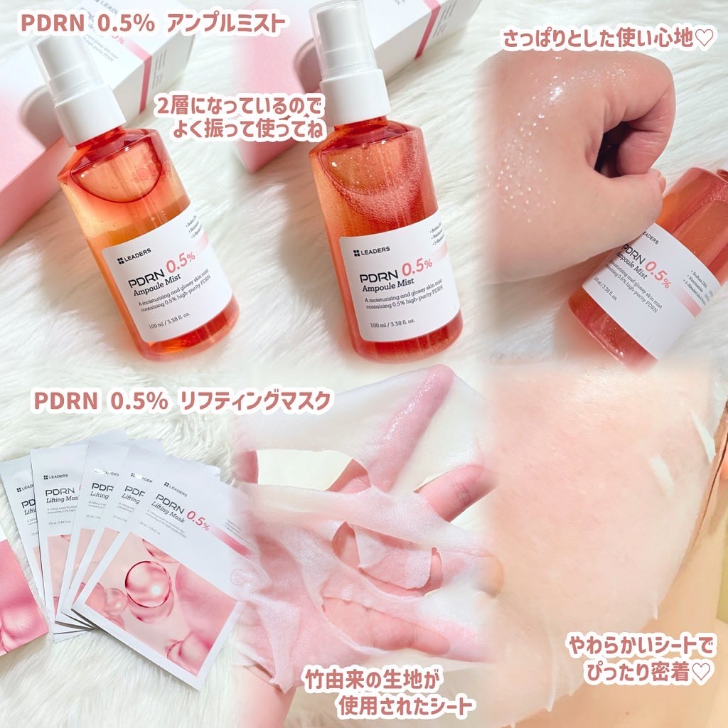 LEADERSリーダースPDRN5%アクティブアンプルPDRN0.5%エッセンスパッドPDRN0.5%アンプルミストPDRN0.5%リフティングマスク4点試してみたよ。PDRN5%アクティブアンプルは高純度サーモン由来PDRNを5%(50,0...