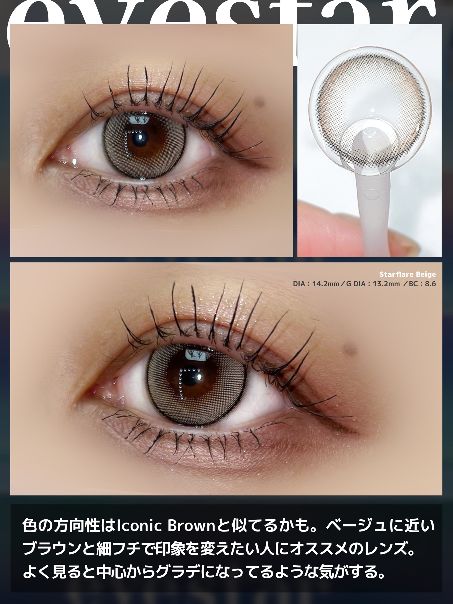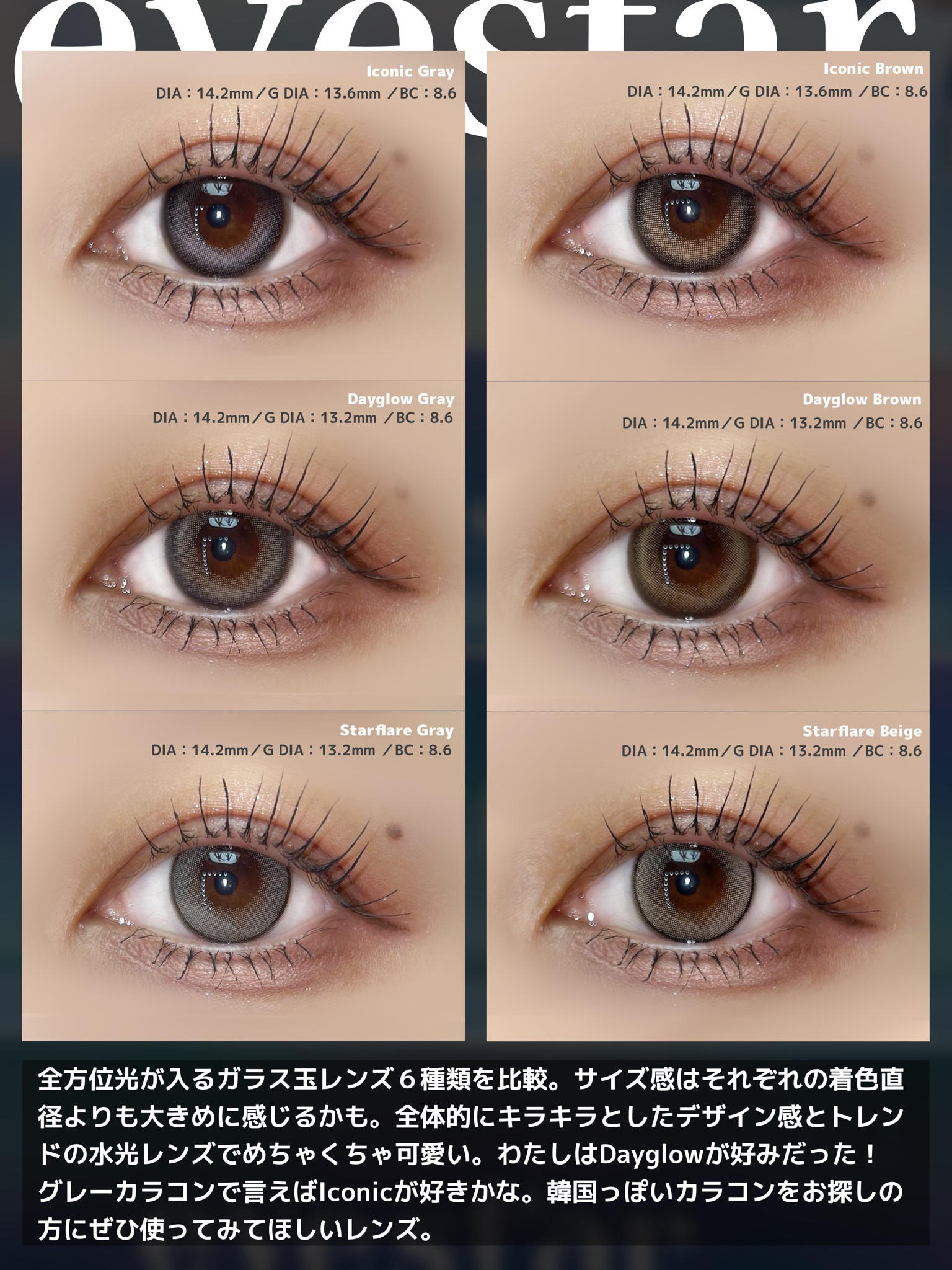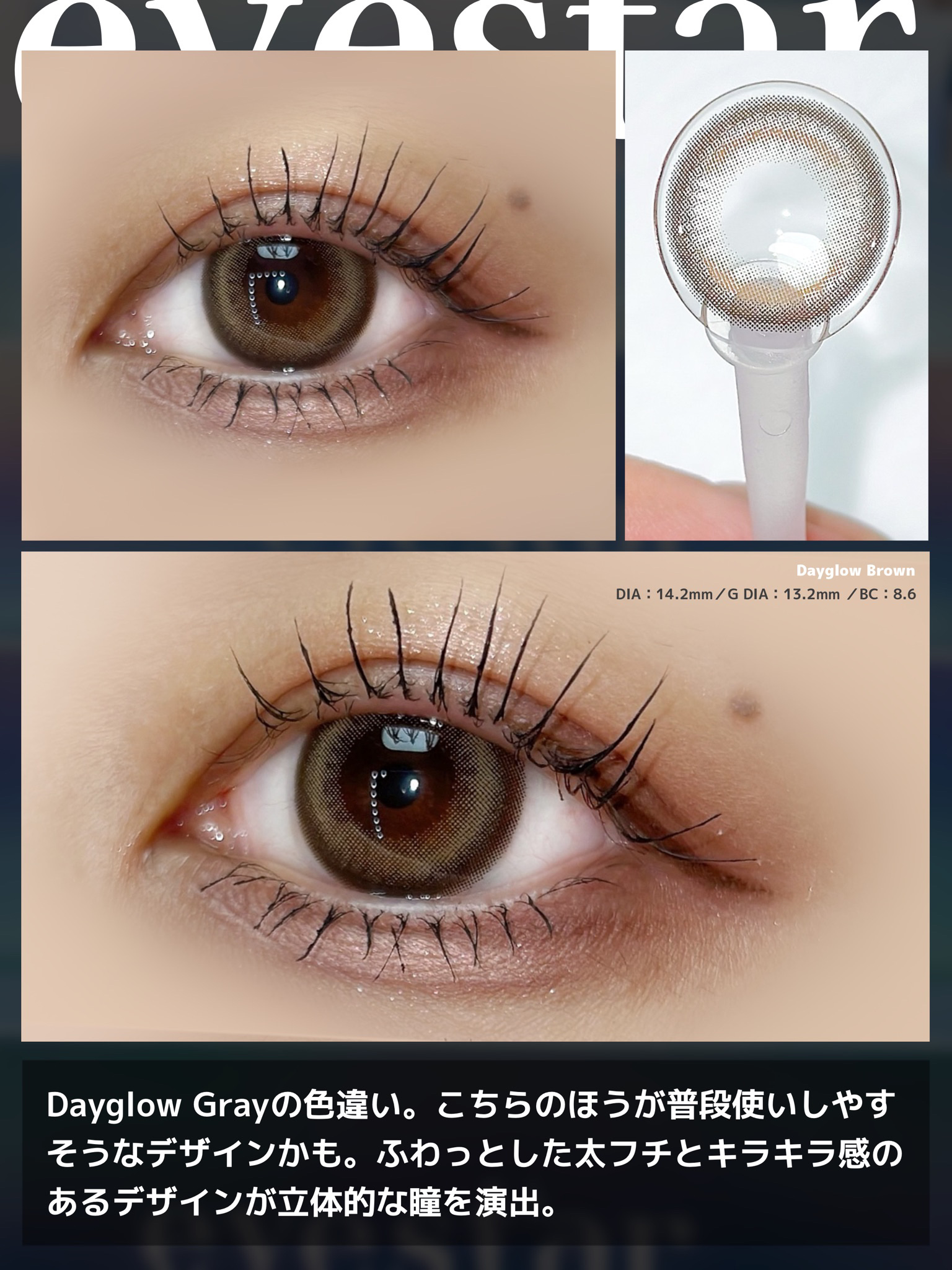 - ガラス玉に閉じ込めた無数のきらめきが、あなたの瞳で自信に変わる。 回っても、ずれても、輝きが続く”ガラス玉レンズ”。 <アイコニックグレー > 水面に揺れる光のようなきらめきで印象的な瞳を叶えます。 瞳の輪郭を優しく縁取る太フチに、象徴的な半月ハイライトが瞳に上品な立体感を与えます。 <アイコニックブラウン > 水面に揺れる光のようなきらめきで印象的な瞳を叶えます。 瞳の輪郭を優しく縁取る太フチに、象徴的な半月ハイライトが瞳に上品な立体感を与えます。 <スターフレアグレー > 降り注ぐ星屑のようなハイライトデザインが、ドラマティックな輝きを与えます。 視線を奪うくっきりとした細フチに、繊細に重なり合うハイライトが主役級の輝きをプラスします。 <スターフレアベージュ > 降り注ぐ星屑のようなハイライトデザインが、ドラマティックな輝きを与えます。 視線を奪うくっきりとした細フチに、繊細に重なり合うハイライトが主役級の輝きをプラスします。 <デイグローグレー> 光をふわりと滲ませるグローカラーが、瞳にヘルシーな艶を仕込みます。 ナチュラルに滲むようなぼかしフチでくりっとした立体感を演出し、内側のグロウカラーが、瞳に光沢感をプラスします。 <デイグローブラウン > 光をふわりと滲ませるグローカラーが、瞳にヘルシーな艶を仕込みます。 ナチュラルに滲むようなぼかしフチでくりっとした立体感を演出し、内側のグロウカラーが、瞳に光沢感をプラスします。 カラーコンタクトレンズの不適正使用による眼障害の危険性等などがあります。 ●コンタクトレンズは高度管理医療機器です。不十分な洗浄・消毒など不適切なケアや、長時間・交換期間を超えた装用により、アレルギー性結膜炎、角膜感染症、角膜潰瘍等の重篤な眼障害が発生する危険性があります ●ご使用前に取扱説明書を確認してください 使用上の留意事項 ●眼科医院等を受診してからお求めください ●眼に異常を感じたら直ちにレンズ使用を中止し、お近くの眼科等で診察を受けてください ●医師の指示にしたがってご使用ください ●コンタクトレンズを装用する場合、自覚症状がなくても、眼科医院等での定期検査を受けてください ●レンズに不具合がある場合は使用しないでください