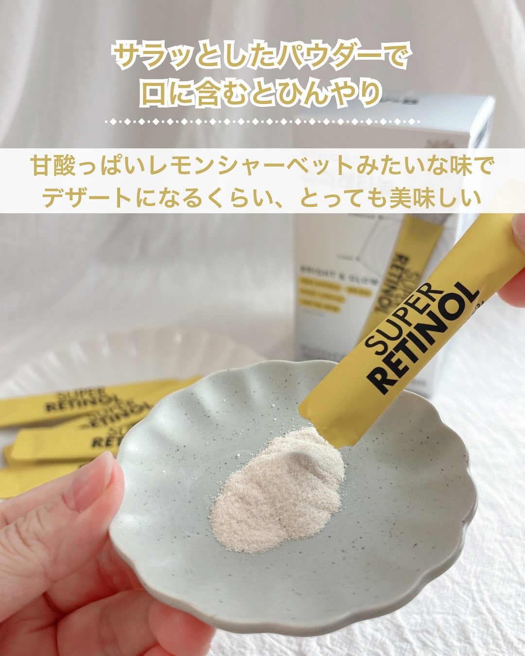 - 食べるタイプのレチノール 1) 専門家のフォーミュラ Flex! - 皮膚科専門医とアモーレパシフィックが共同開発 29年間蓄積したレチノール技術で完成! 食べるレチノールプロテクション技術を適用 (ビタミンA、1000ugRAE配合*) 2) 明るく輝く! - 豊富に含むビタミンC1,000mg含有* - パントテン酸1日栄養成分基準配合* - ビタミンE、ビタミンD、亜鉛 副成分 L-システインとヘスペリジンを配合 3) さわやかなシトラスの味 「ヴィーガンレチノール」 - ヴィーガン認証を取得した毎日摂取できる美味しいレチノール *上記の栄養成分の数値は、2包摂を基準に作成された含量です *お召し上がり方! 1回1~2包を 直接摂取してください