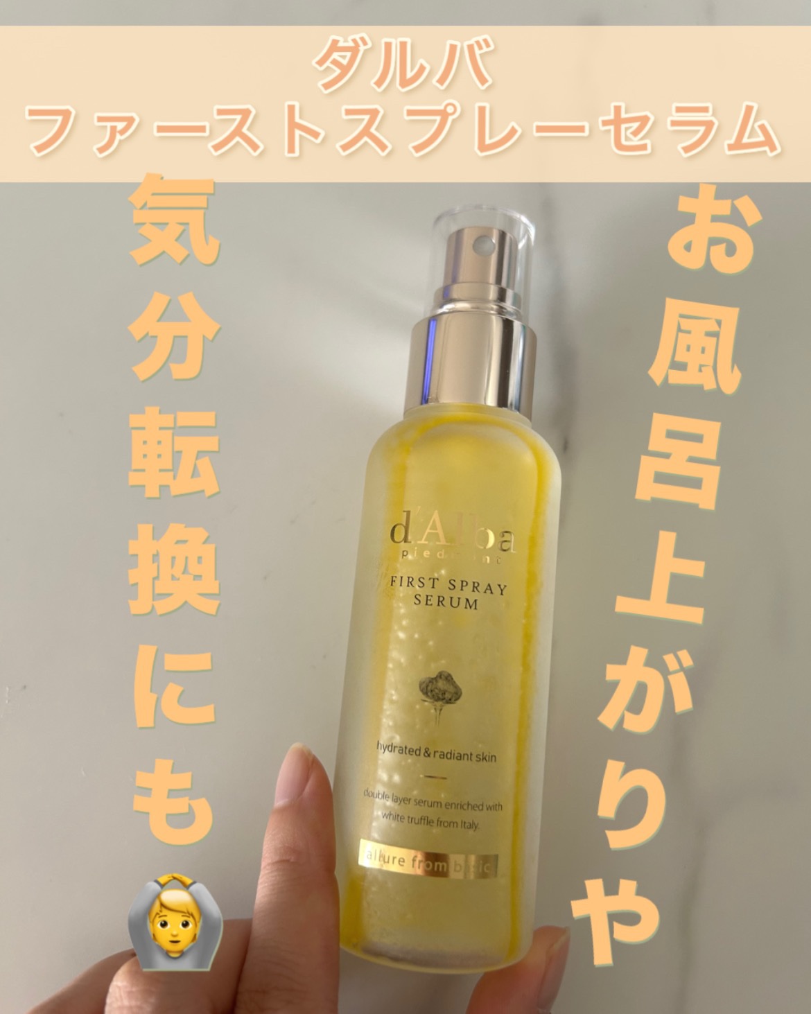 高級感のある透明のボトルからは中が2層になっているのがよく見えます。上の方が黄色く、下は透明です。 イタリア産ホワイトトリュフが入っているセラムです。オイルの層はボトルを振るとすぐに混ざります。 シュッシュッとお肌にかけてふんわりいい香りを楽しみます。とってもいい香りがするんですよ。