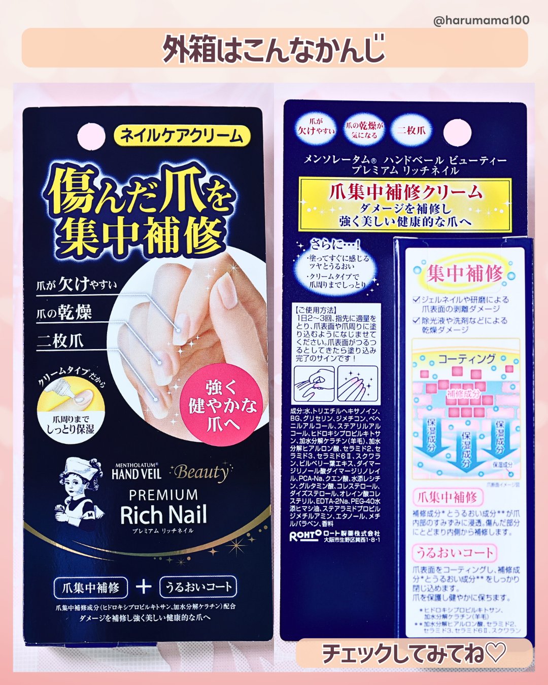 - 「メンソレータム ハンドベール ビューティー プレミアムリッチネイル」は、爪を保護し、すこやかに保つ爪集中補修クリームです。爪が欠けやすい人や爪の乾燥が気になる人、二枚爪の人などにおすすめです。ジェルネイルや研磨によりダメージを受けた爪表面を補修し、除光液や洗剤などにより乾燥した爪周りを保湿。強く美しい健康的な爪へ導きます。