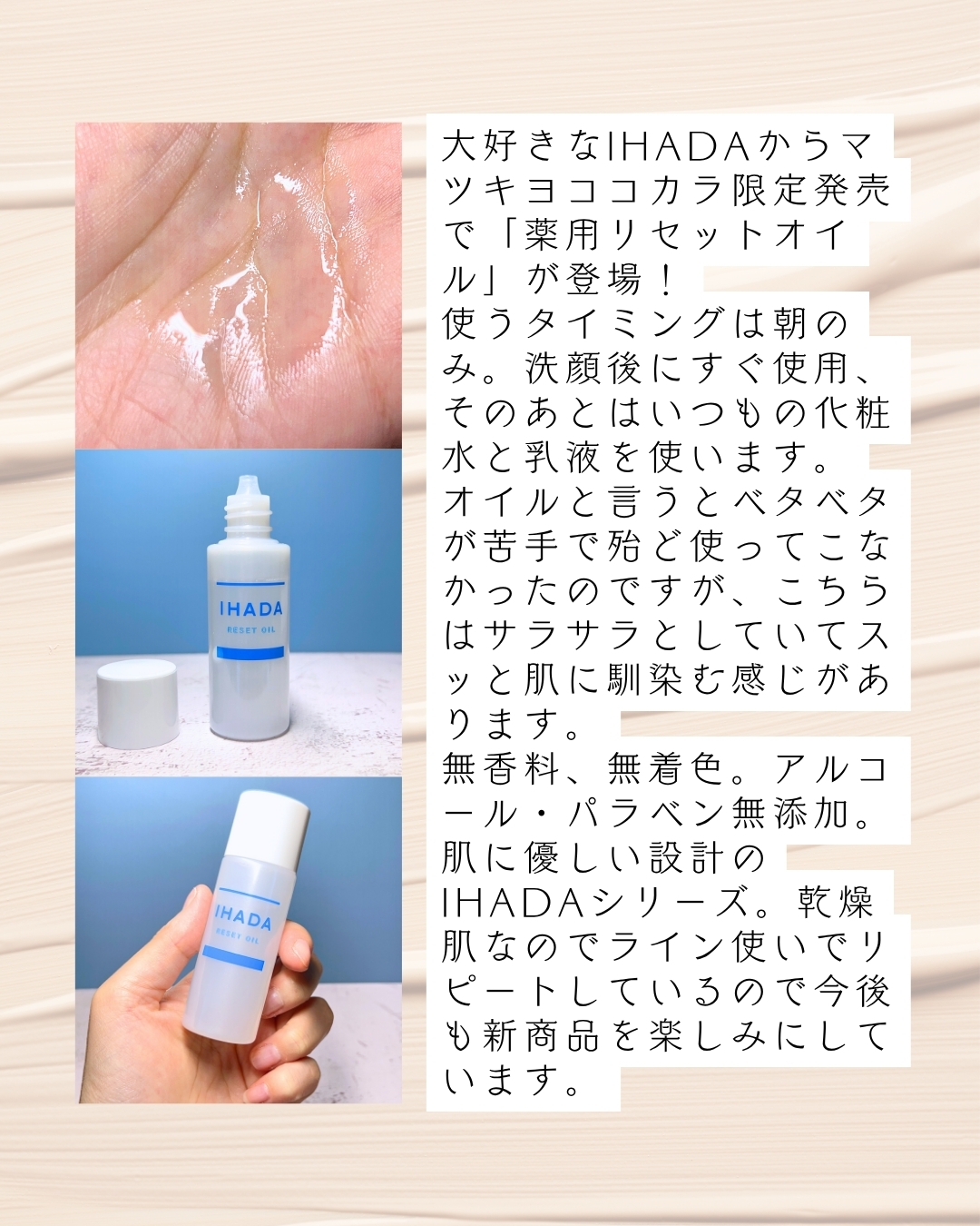 イハダから商品提供を頂きましたイハダってほんとに、「こういうのほしかった」っていうアイテムを出してくれるよねお手入れを手抜きしちゃった日の翌朝、洗顔後すぐに使う、薬用オイル状美容液Wの肌荒れ防止有効成分(グリチルリチン酸ジカリウム/酢酸DL-...