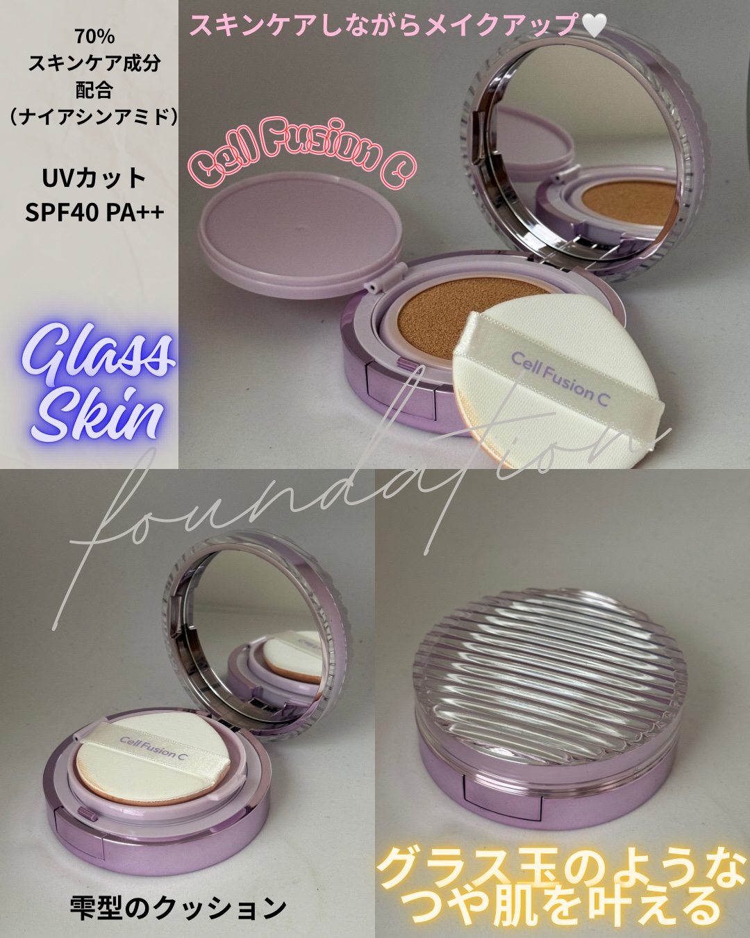 ⚪️CellFusionC⚪️グラススキンクッション【19Cピンクアイボリー】☪️スキンケア成分70%配合重ね塗りしても呼吸できる✨肌のためのクッション🤍パッケージが綺麗💜✨わたしは血色感をプラスしたい明る目なカラーを選びました🎶ピンクアイボ...