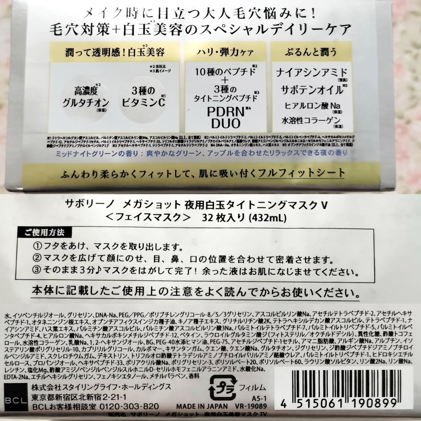 - メイク時に目立つ毛穴悩みに、毛穴対策+白玉*¹美容のスペシャルなデイリーケア。おやすみ前のお手入れはこれ1枚で完了!オールインワン処方の夜用マスク。 リッチな潤い成分配合で肌に美しい透明感。 【高濃度*²グルタチオン(保湿)】アミノ酸からなる成分で、美しく透明感のある肌に 【3種のビタミンC*³】 毛穴ゆるみをキュッとタイトニングしてもっちり肌。 毛穴の目立ちにくいハリと弾力のあるもっちり肌へと導きます。 【10種のペプチド】 ・パルミトイルテトラペプチド-7 ・パルミトイルトリペプチド-5 ・パルミトイルペンタペプチド-4 ・ヘキサカルボキシメチルジペプチド-12 ・アセチルジペプチド-1セチル ・パルミトイルトリペプチド-1 ・ヘキサペプチド-33 ・トリフルオロ酢酸テトラデシルアミノブチロイルバリルアミノ酪酸ウレア ・酢酸アミジノベンジルベンジルスルホニルD-セリルホモフェニルアラニンアミド ・ジ酢酸ジペプチドジアミノブチロイルベンジルアミド 【3種のタイトニングペプチド】 ・アセチルヘキサペプチド-1 ・テトラペプチド-1 ・アセチルテトラペプチド-2 【PDRN DUO】 ・DNA-Na ・オタネニンジン根エキス ・ハス葉エキス(以上、全て保湿) ナイアシンアミド配合で、肌のベースからアプローチ。 たっぷりの保湿成分とナイアシンアミド(整肌成分)を配合。 肌を内側からぷるんと白玉*¹肌へと整えます。 ・ナイアシンアミド(整肌) ・サボテンオイル*⁴ ・ヒアルロン酸Na(保湿) ・水溶性コラーゲン(保湿) 1枚貼るだけ!オールインワン処方 化粧水+乳液+美容液+クリーム+パック <小鼻を包み込むサボリーノオリジナルシートマスク> 液含みの良いシートで、肌あたりも優しくたっぷりひたひたの使い心地です。 サイドの切れ込みを持ち上げるように引き上げてお使いください。 ミッドナイトグリーンの香り 爽やかなグリーンの香りにアップルの香りを合わせた、 夜のひとときをリラックスさせてくれる香りです。 *1 肌イメージ *2 当社比 *3 テトラヘキシルデカン酸アスコルビル、パルミチン酸アスコルビルリン酸3Na、アスコルビルリン酸Na(以上、全て整肌) *4 オプンチアフィクスインジカ種子油(保湿)